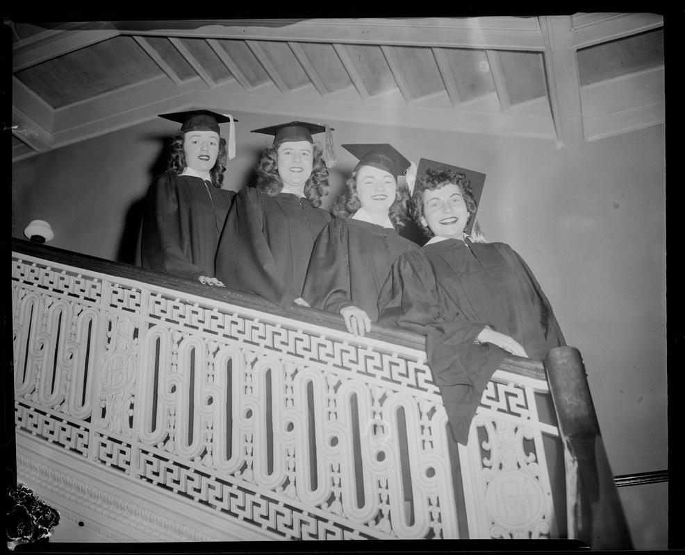 Four graduates of Northeastern University stand on the stairwell during commencement activities at Symphony Hall. Northeastern has held numerous commencements and convocations at Symphony Hall from the Hall's earliest days through the 1960s.