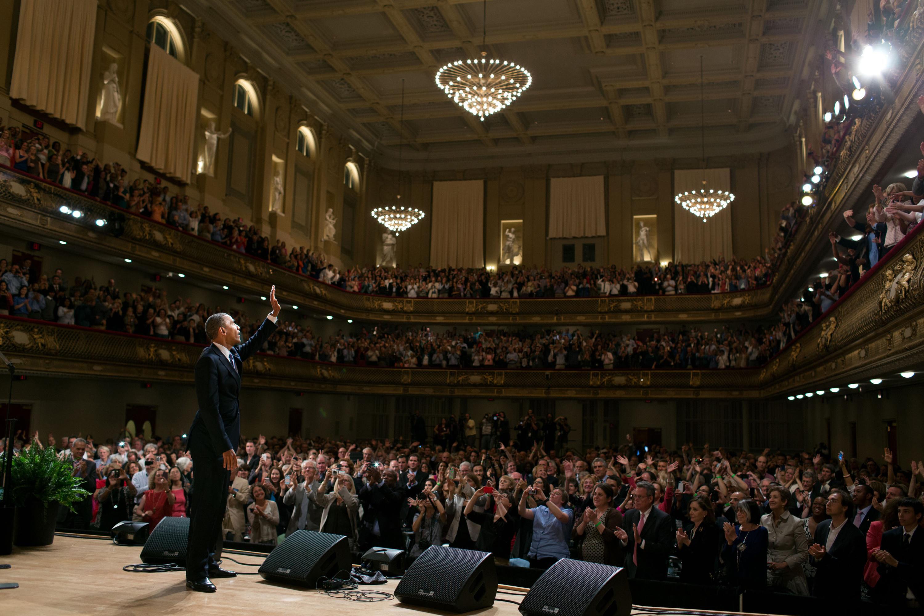Capping off a fundraising trip to Boston as part of his re-election campaign against Senator Mitt Romney in 2012, the former President spoke before 1,600 supporters at the Hall on health care, Wall Street reform, and affordable higher education. (WBUR, June 26, 2012).