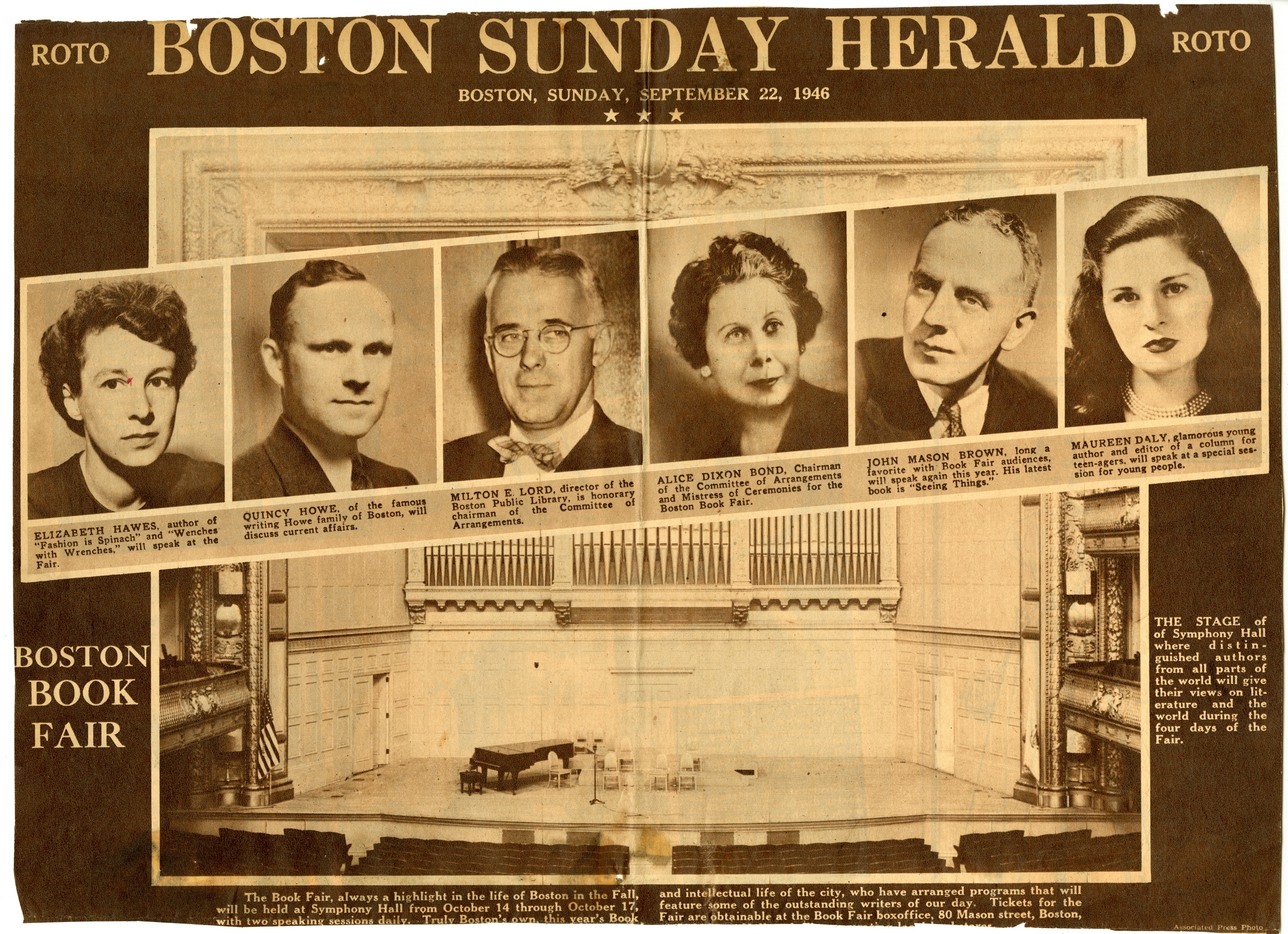 In 1946, the Hall hosted a book fair through the Boston Herald. Run by a committee made up of leaders in the civic and intellectual life of the city, the fair featured current popular writers in various speaker sessions. Authors spoke on the writing process and their views on literature in the world from the stage of the Hall, which held three of the Herald’s book fairs in the 1940s.