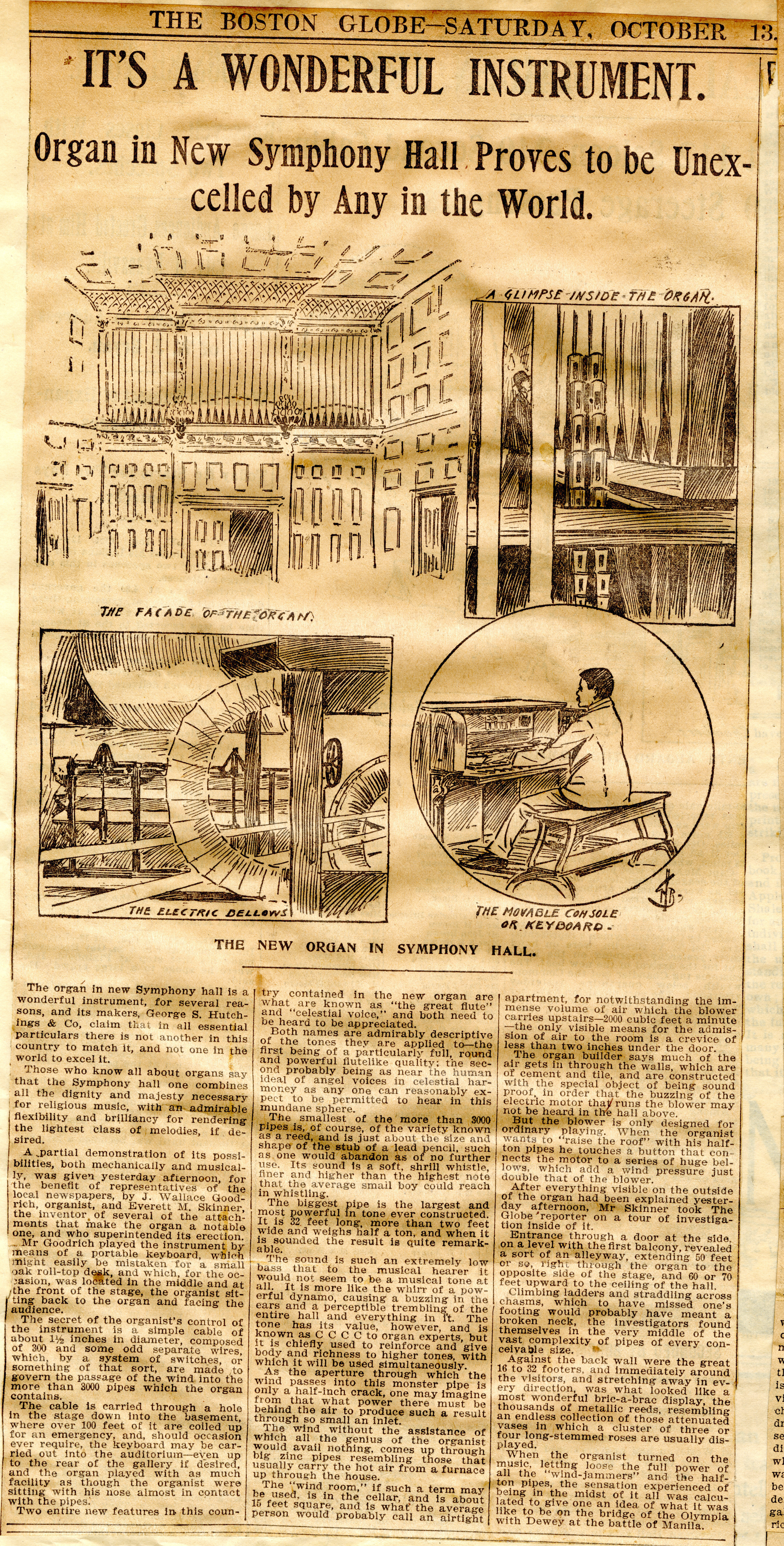 A local of Newton, Massachusetts, Goodrich was an organist, conductor, and composer. The newspaper article featured above reports on the installation of the organ inside the Hall in 1900. Goodrich gave a demonstration of the instrument on the 13th and a formal organ recital on October 25th, one of the earliest recitals in the Hall. The Globe reported that Goodrich’s “mastery of the instrument was quickly made evident, and his playing was most artistic and satisfying. (Boston Globe, October 26, 1900)