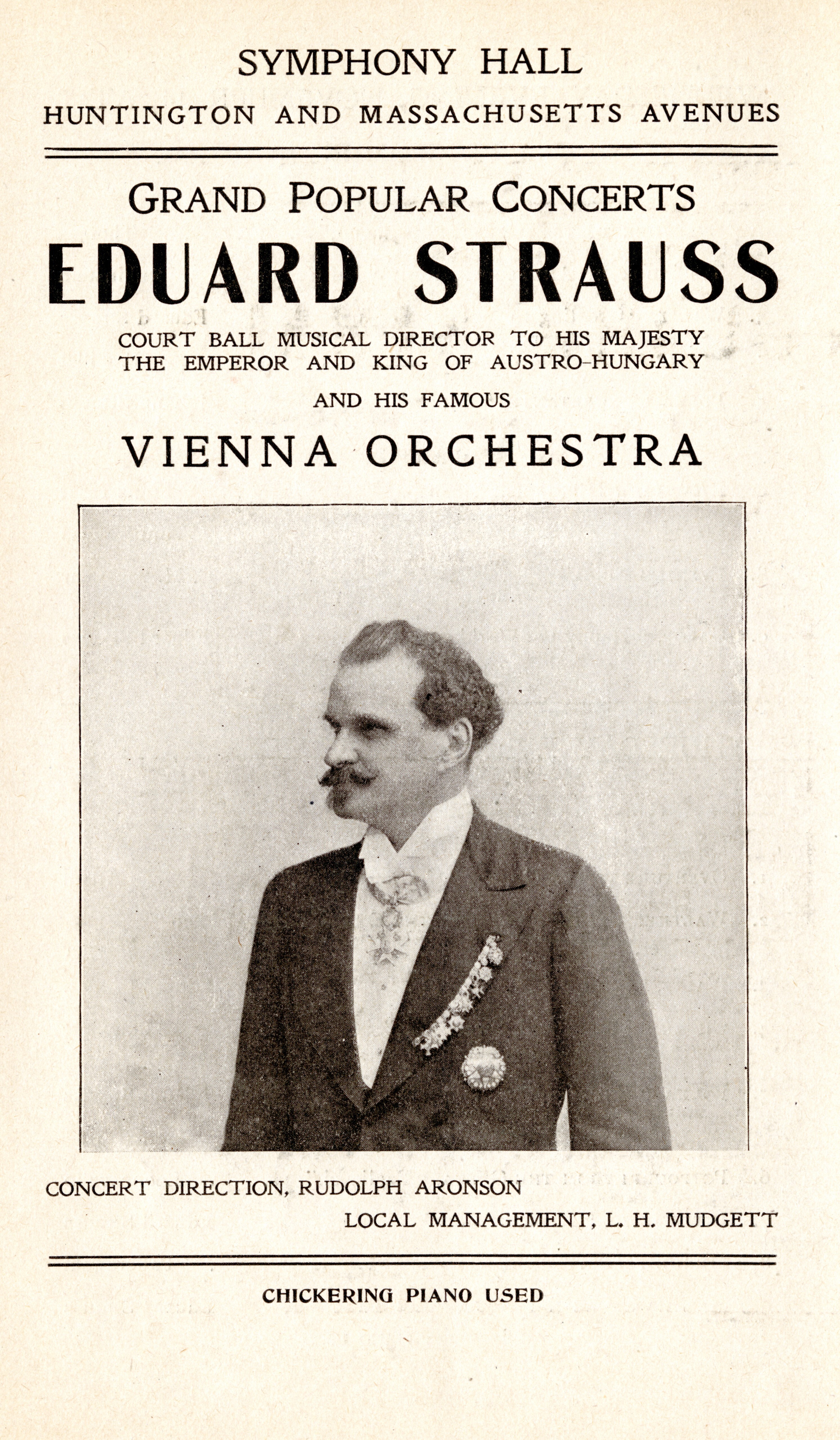 Eduard Strauss was an Austrian composer and part of the renowned Strauss family who dominated the light music world for decades. Strauss performed dance music and selections from Beethoven, Bizet, and Gillet. The public particularly enjoyed the Strauss numbers from both Eduard and Johann Strauss, Sr., Eduard’s father. (Boston Globe, November 15, 1900)