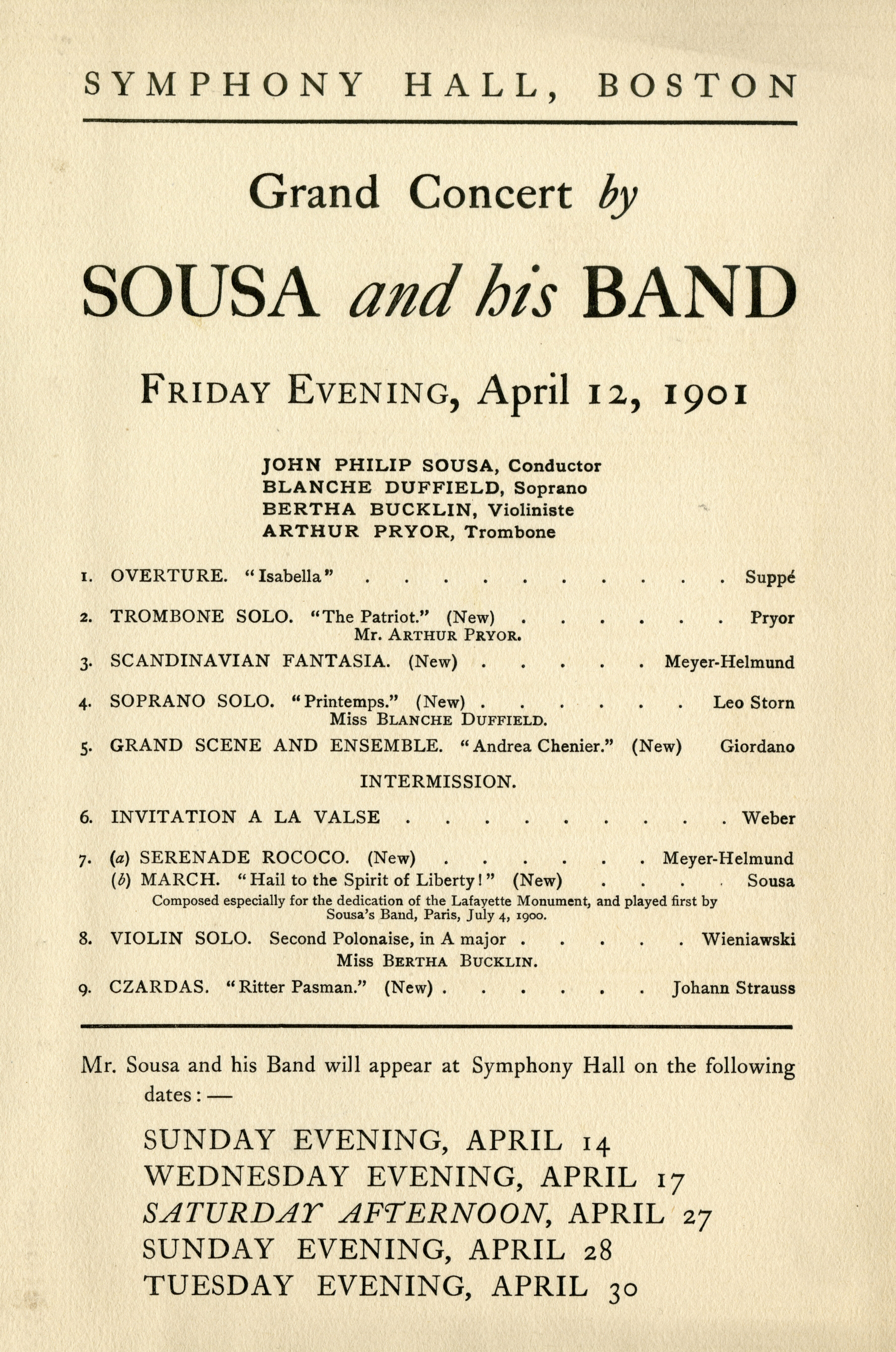 Originally part of the Marine Corps Band, John Philip Sousa formed a civilian band after he was discharged in 1892. Touring in both the United States and internationally, the band performed until the 1930s. At Symphony Hall they were quite popular with a “very large audience applauding every number” and “demanding double encores.” (Boston Globe, April 13, 1901)