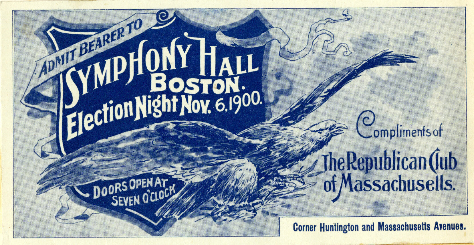 The Republican Club hosted an Election Night event in the brand-new Hall with nearly 3000 men and women in attendance. Eventgoers watched the returns of the election as they were flashed from a stereopticon, a popular machine for projection in the early twentieth century. (Boston Globe, November 7, 1900).
