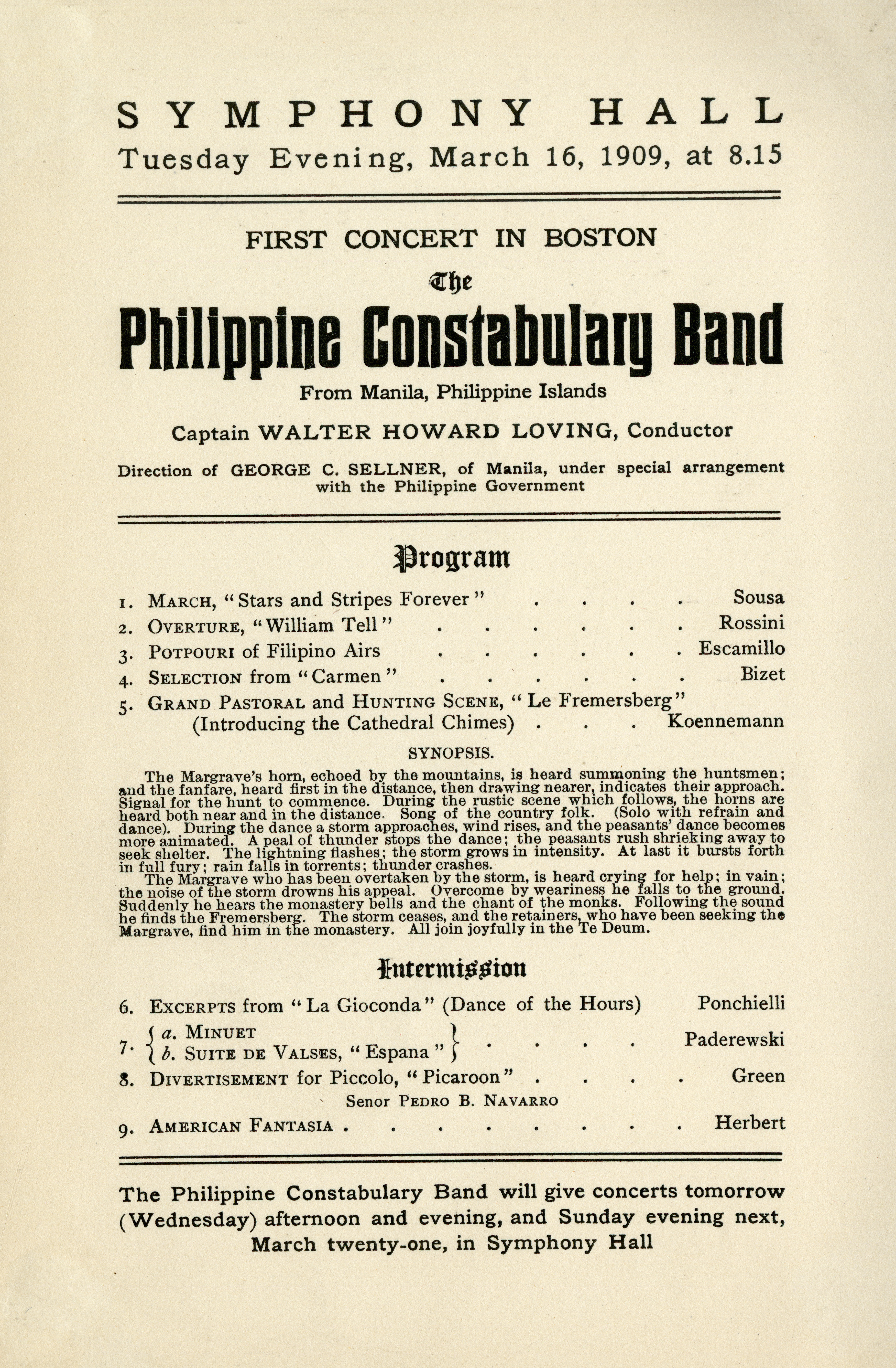 The son of a formerly enslaved person, Captain Walter Howard Loving, an African American soldier, conducted the Philippine Constabulary Band. Loving led the band during the 1909 presidential inaugural parade where it was an official escort to President Taft, the first time a band other than the U.S. Marine Band was assigned that duty.