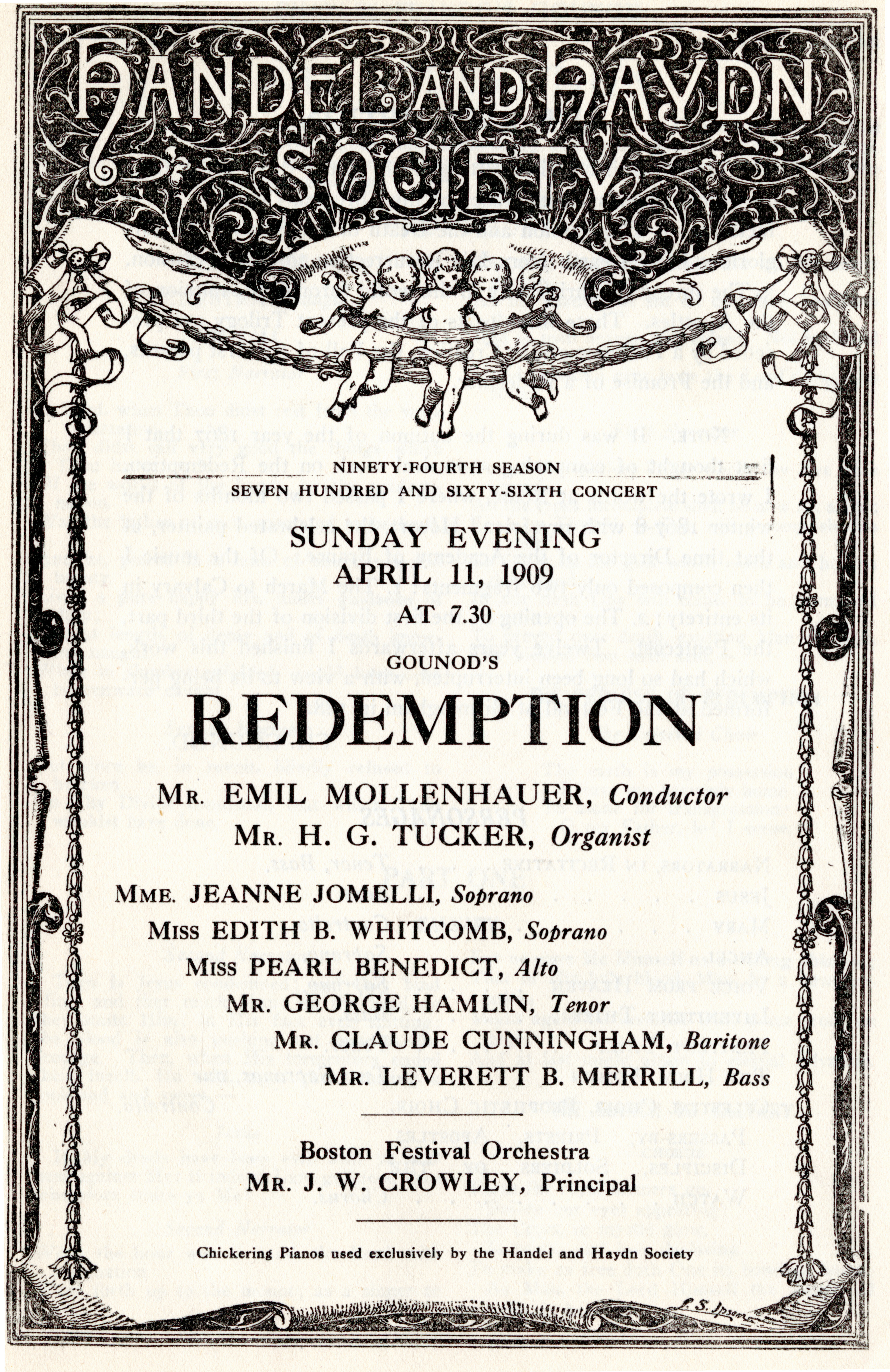 Program book for Handel and Haydn Society’s performance of Gounod’s “Redemption” on April 11, 1909.