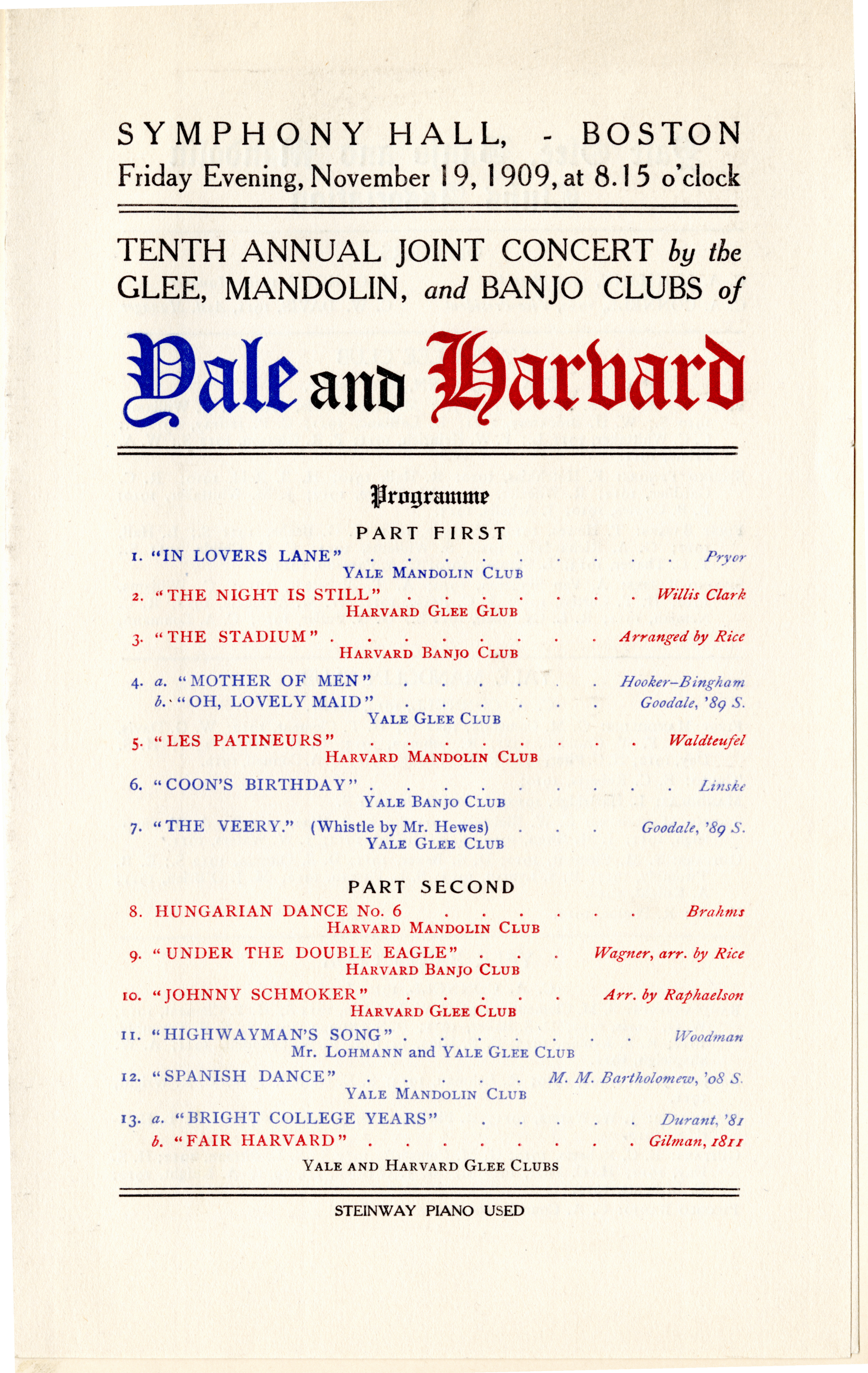 Program book for performances by the Glee, Mandolin, and Banjo Clubs of Yale and Harvard on November 19th, 1909.