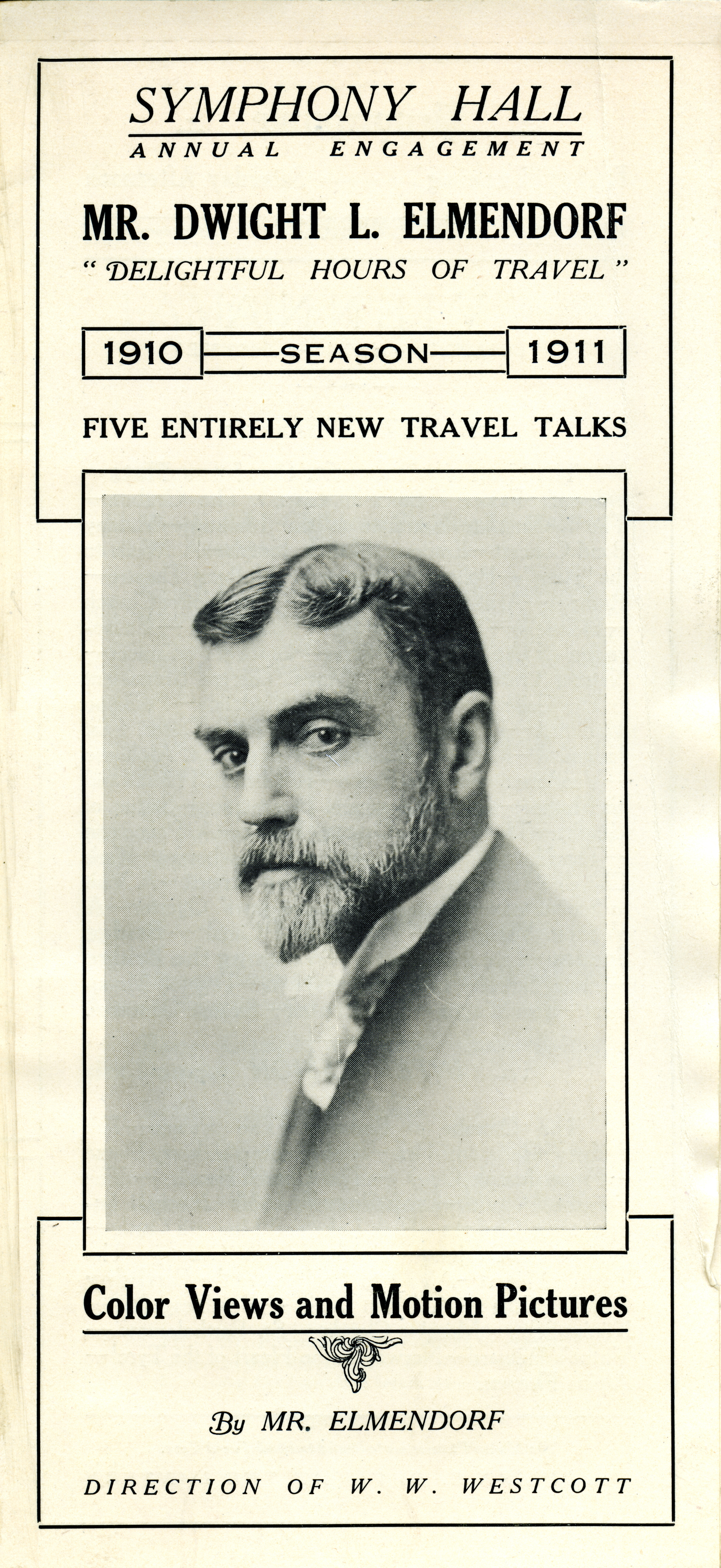 Flyer advertising the travel talks of Mr. Dwight L. Elmendorf, November 1910.