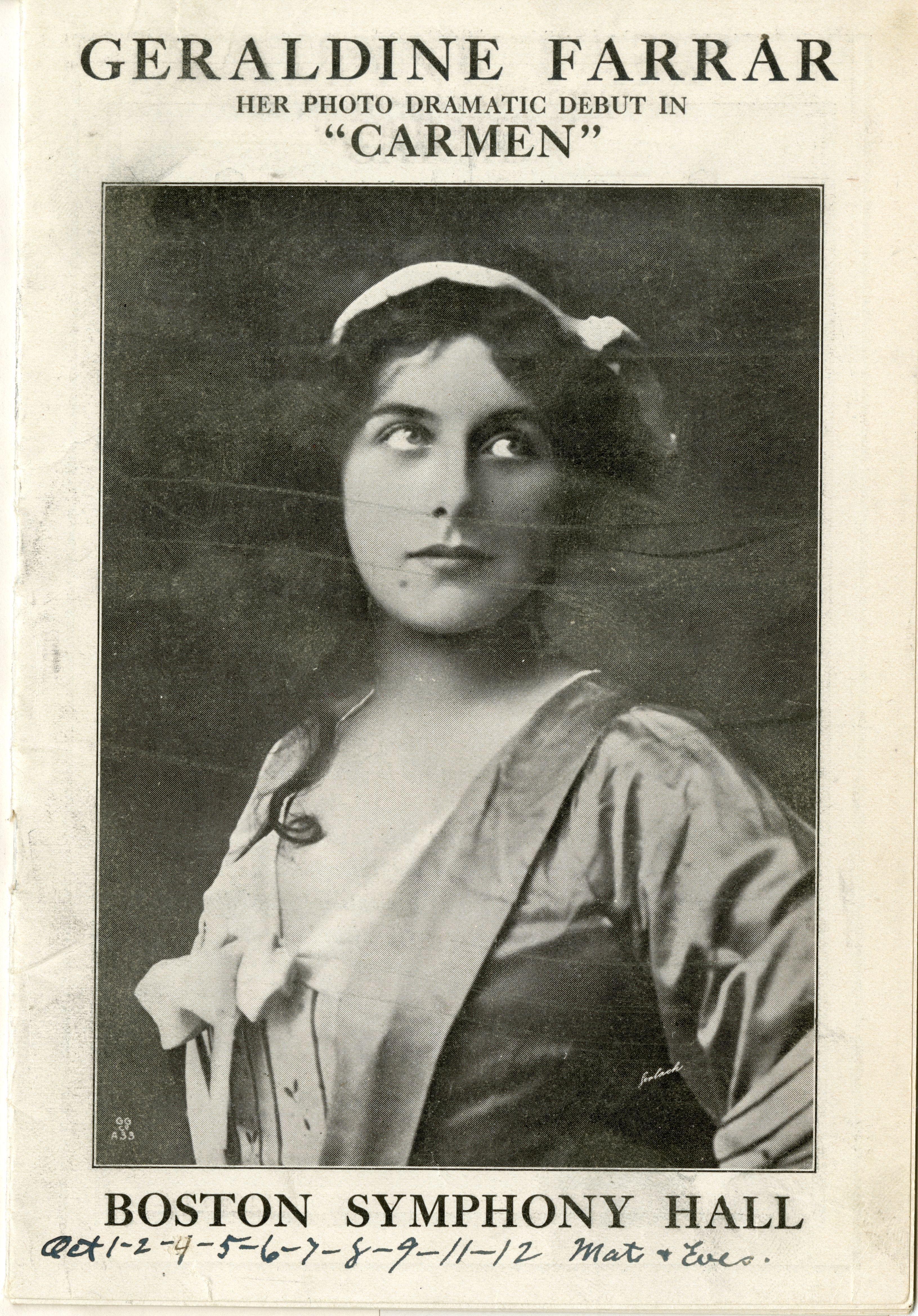 The first viewing of the silent movie version of “Carmen” starring Geraldine Farrar screened at Symphony Hall on October 1st, 1915. An audience of nearly 3000 people gathered to watch the film. The Boston Globe reports that “nothing but praise was heard on every side” as to her acting. Miss Farrar’s presence at the event herself heightened the publicity of the event. (Boston Globe, October 2, 1915).