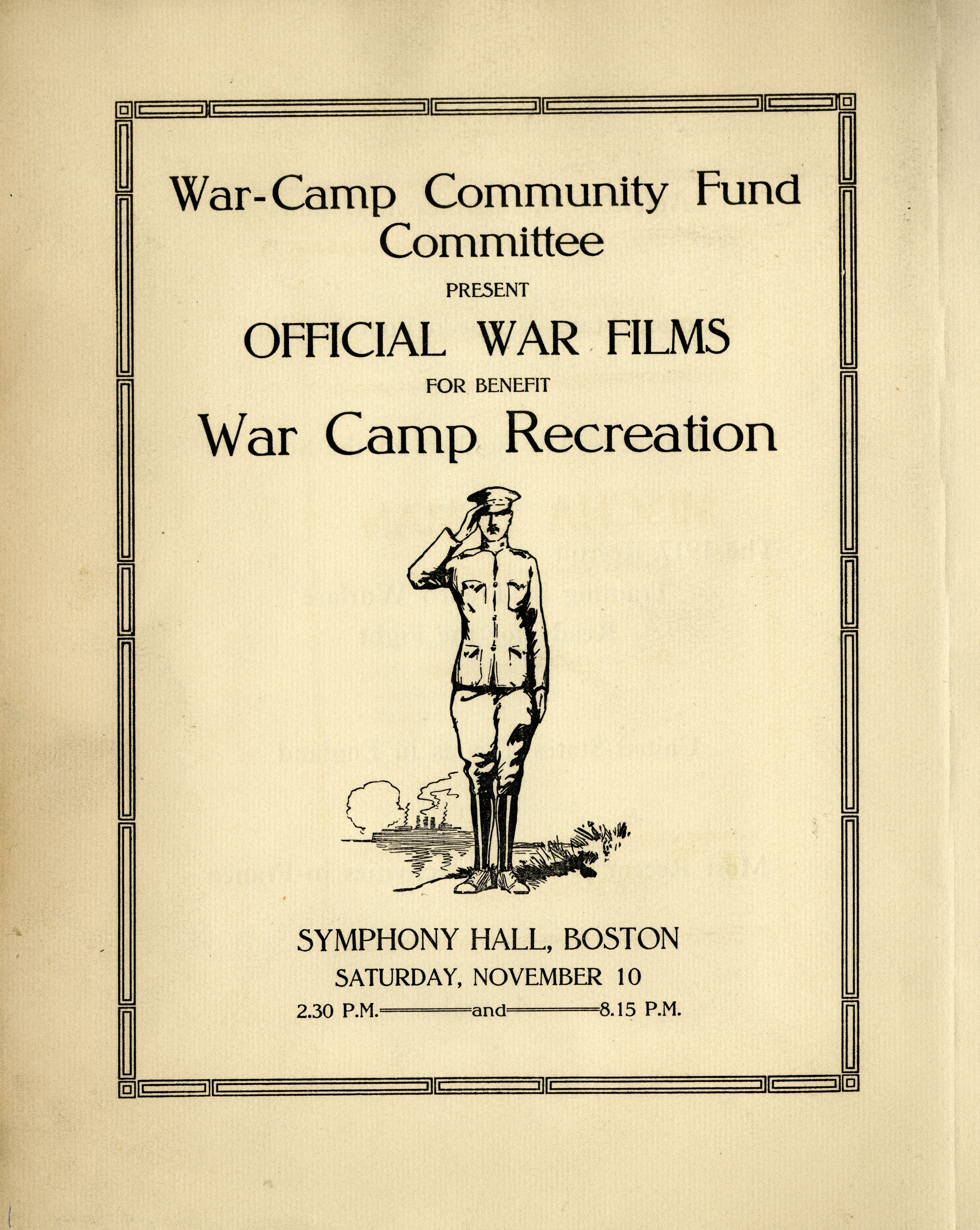 Part of a series of fundraiser events to raise money for troops fighting in World War I, Symphony Hall hosted screenings for a series of war movies in November 1917. The films showed methods of training soldiers, marines, and sailors. Occurring alongside other rallies throughout Boston such as the State Fish Pier, the event was part of a broader effort to encourage people to donate to the war effort. (Boston Globe, November 10, 1917).