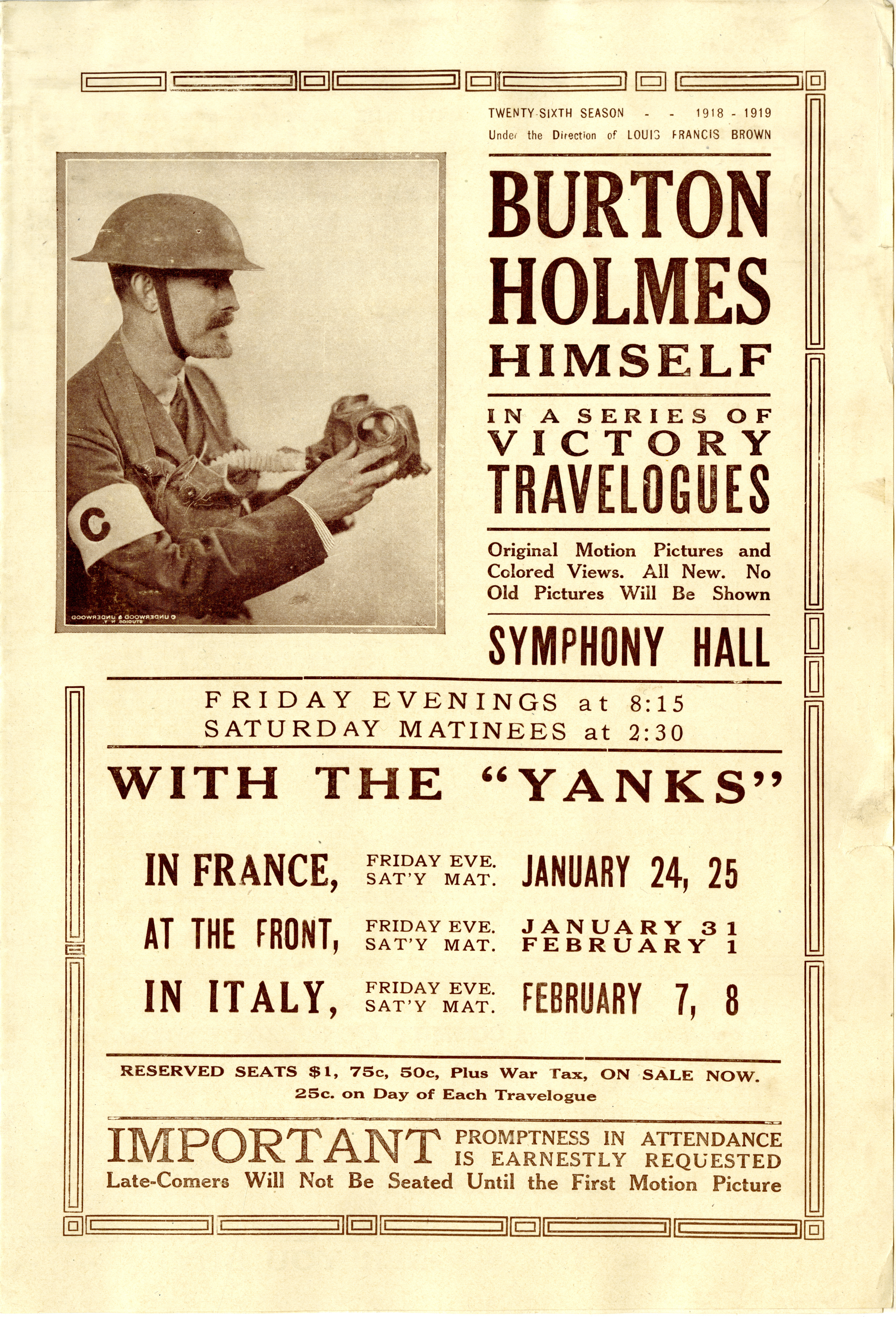 Burton Holmes, a famed travel writer and lecturer, gave numerous lectures at Symphony Hall on various locations including Italy, France, Russia, and regions in South America. In 1919 he presented a series in which each lecture title began “With the Yanks...” which detailed life at war and on the front.