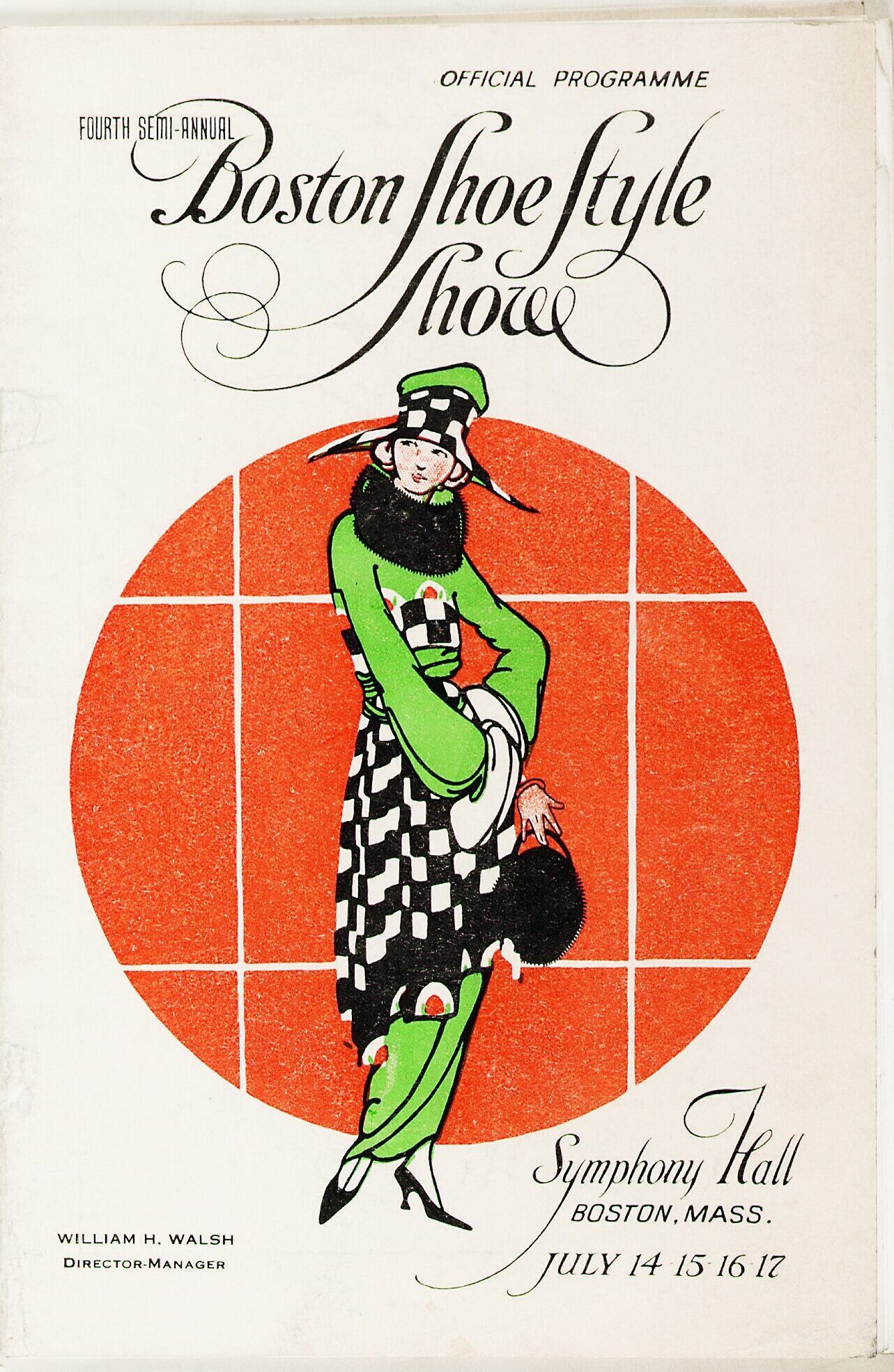 Thomas F. Anderson of the New England Shoe and Leather Association opened the Boston Shoe Style Show in 1919 stating “Every woman in Boston ought to be a walking demonstration of shoe styles and serviceability.” Buyers from all over the country made the rounds of the booths and over 30 women displayed shoe models on a runway decorated with roses. (Boston Globe, July 15, 1919)