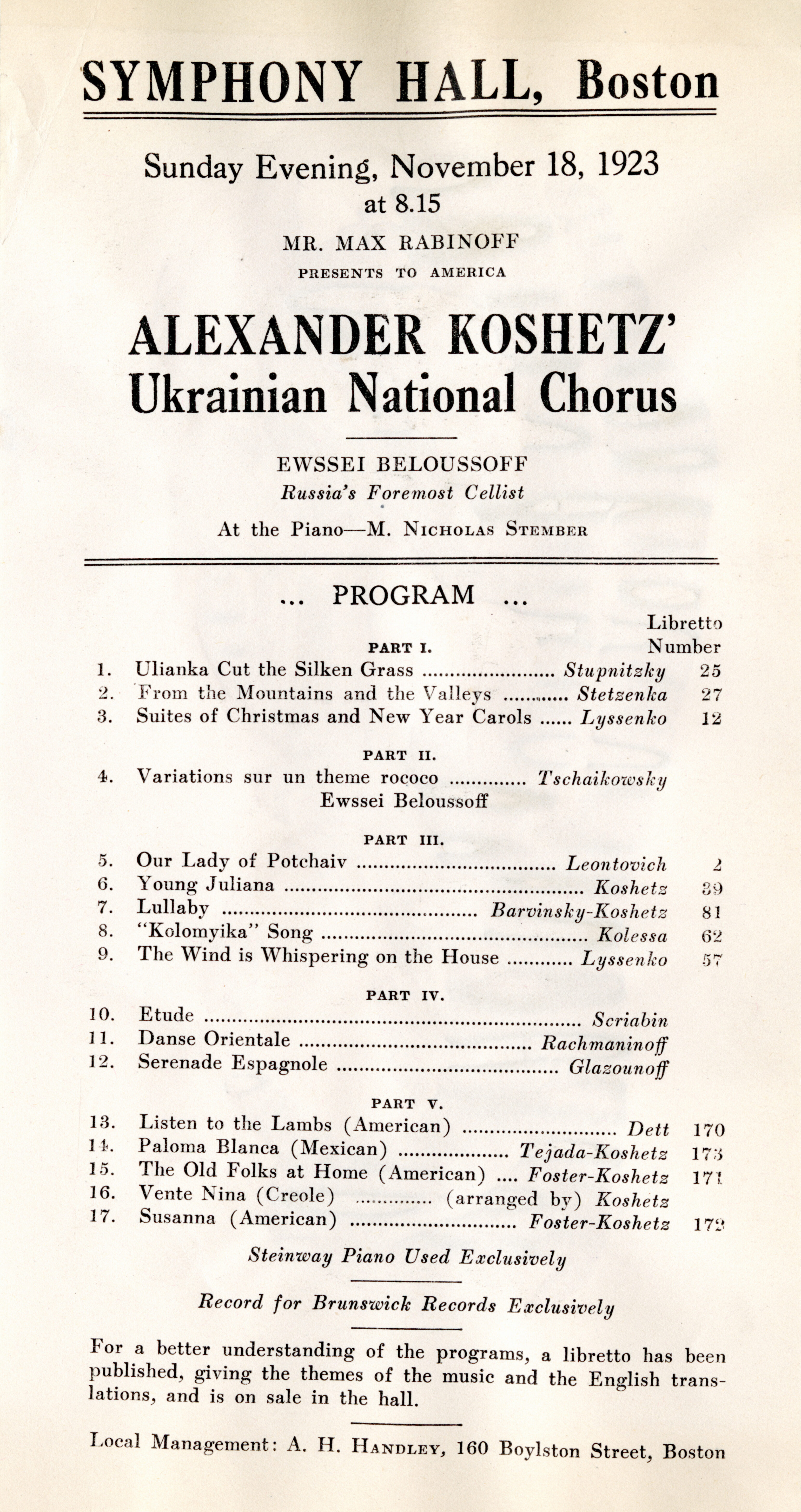 The Ukrainian National Chorus was a musical company that toured Europe and North America in 1923 to promote Ukrainian culture. Presenting folk songs and other classic Ukrainian songs, they performed at Symphony Hall on November 18th, 1923, under conductor Alexander Koshetz.