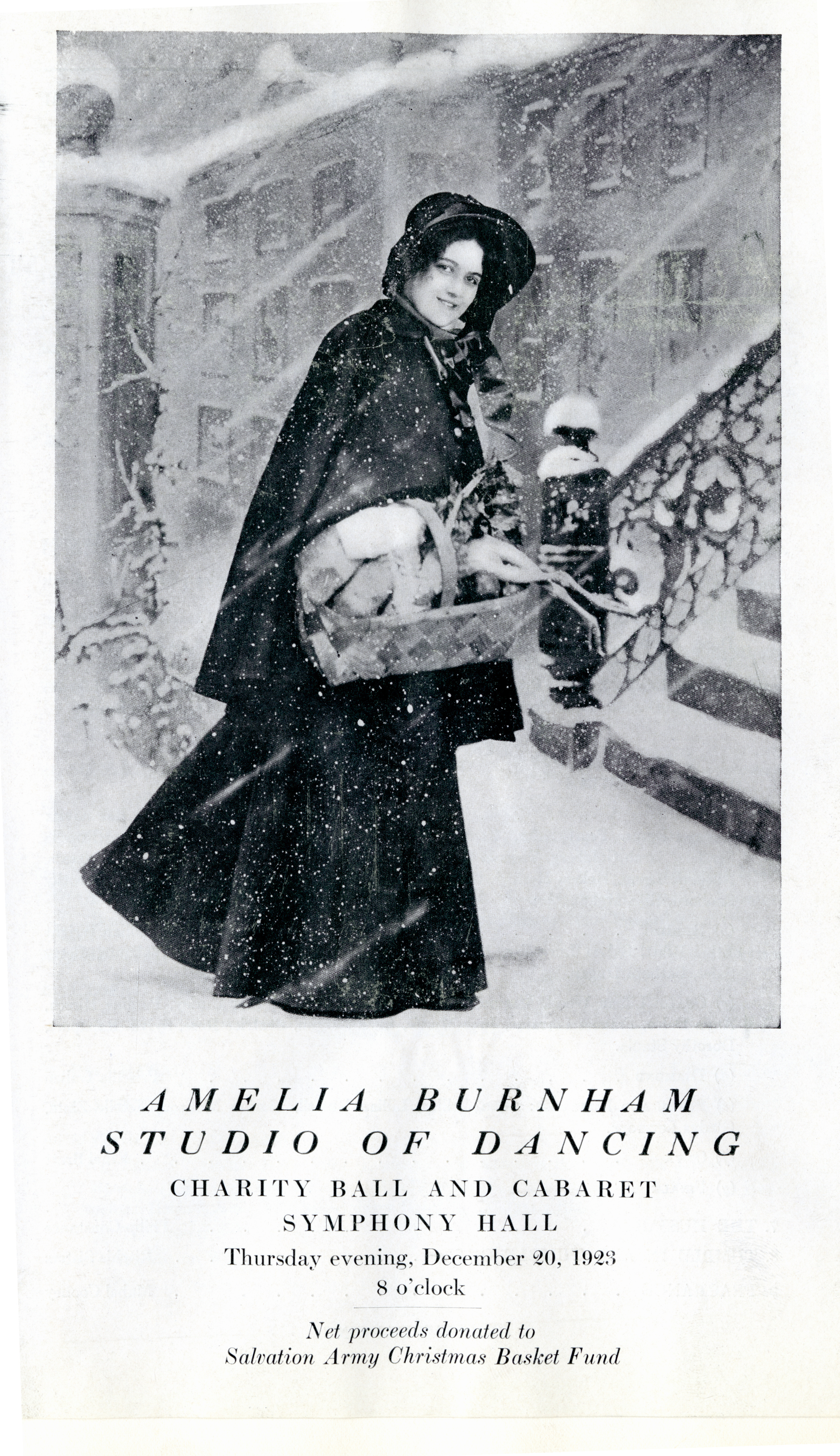 Raising money for the Salvation Army Christmas Basket Fund, the Amelia Burnham School of Dancing hosted a charity ball and cabaret at Symphony Hall in 1923. Vocal numbers, dances, and Christmas stories were given in the Hall as part of the programming. Members of the local community were among the entertainers including women from Hyde Park and Back Bay. (Boston Globe, December 21, 1923).