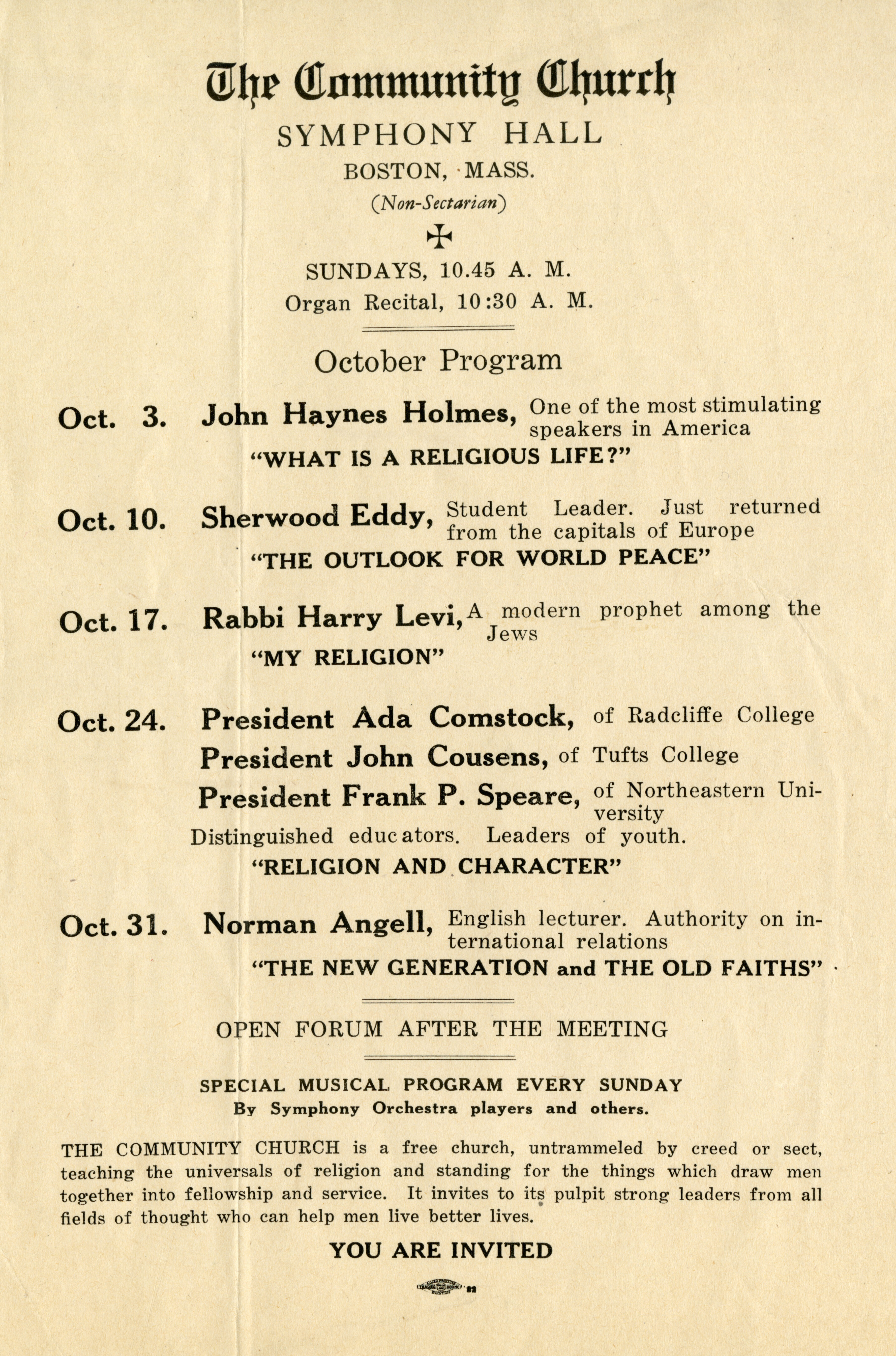 The Community Church of Boston’s fall lecture series in 1926 included lectures from John Haynes Holmes, an American Unitarian Speaker, Sherwood Eddy, a student leader, and President John Cousens of Tufts College. Topics included “What is a Religious Life?” “The Outlook for World Peace,” and “Religion and Character.”