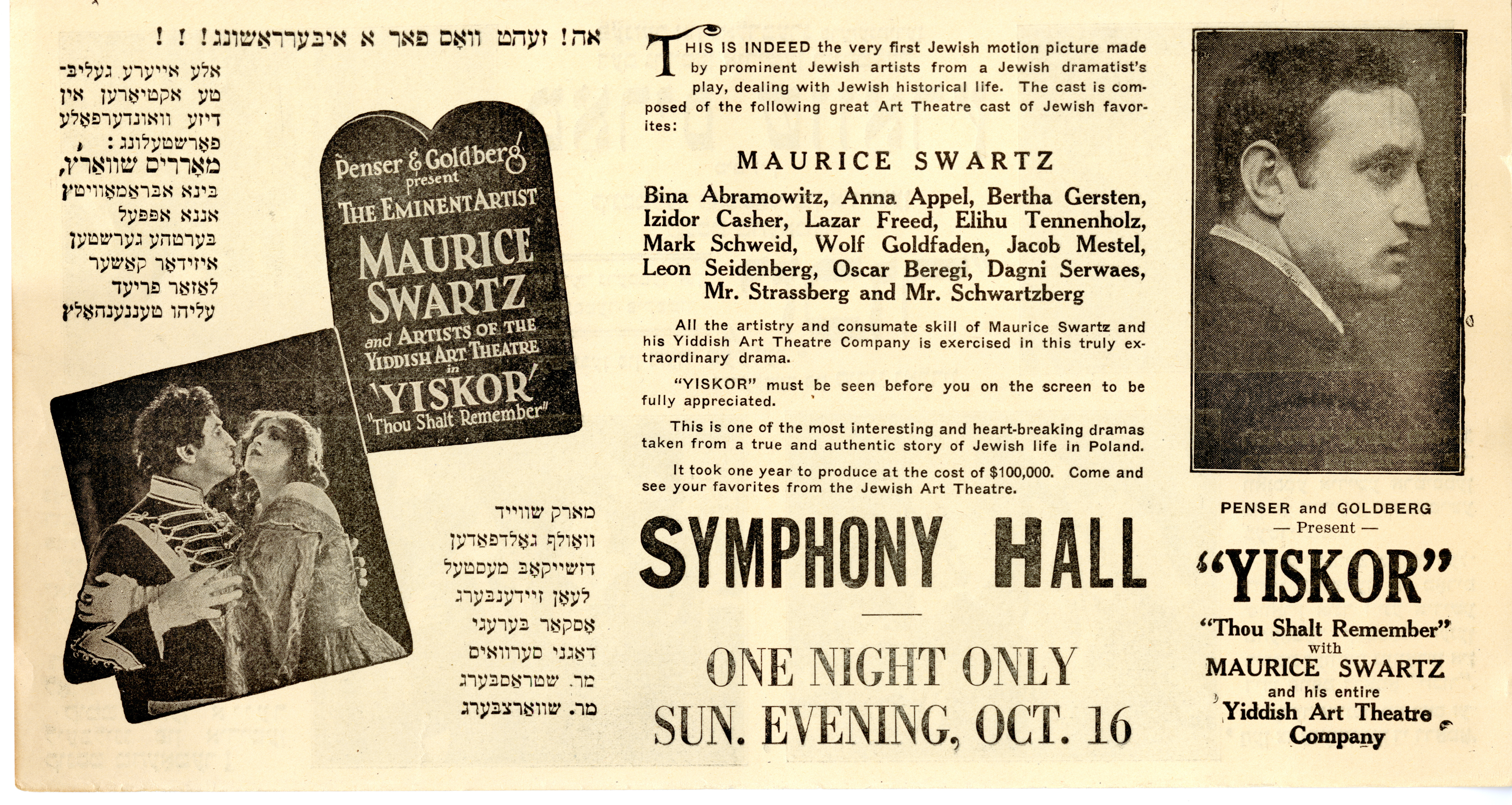 Screened for only one night at the Hall, the film “Yiskor” was billed as the first Jewish motion picture made by prominent Jewish artists from a Jewish dramatist’s play dealing with Jewish historical life. The cast composed of Maurice Swartz and his Yiddish Art Theatre Company, was said to be “one of the most interesting and heart-breaking dramas” about Jewish life in Poland.