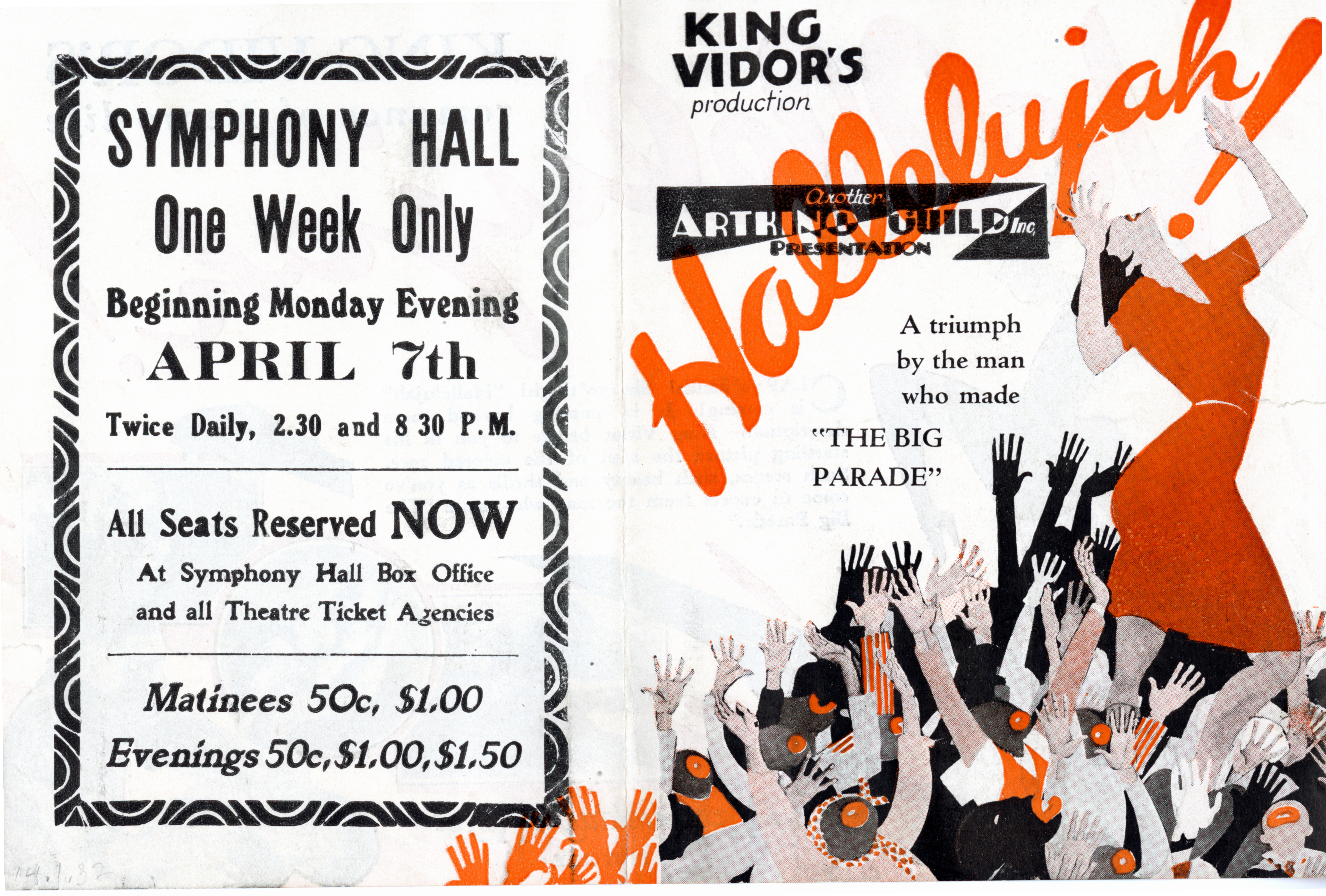 Flyer advertising a screening of King Vidor’s film “Hallelujah!” on April 7th, 1930.
