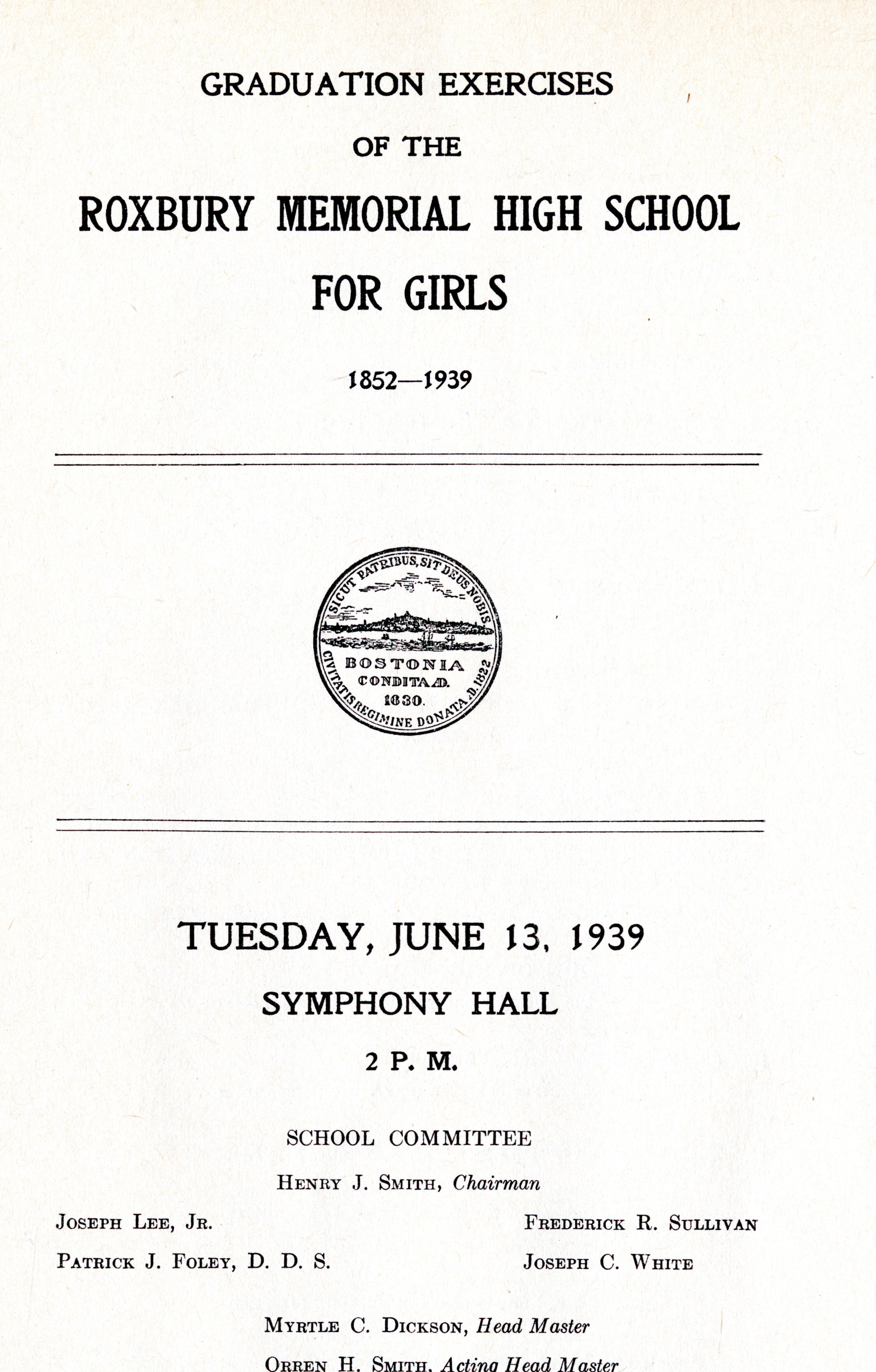 Program book of the commencement of the Roxbury Memorial High School for Girls on June 13th, 1939.