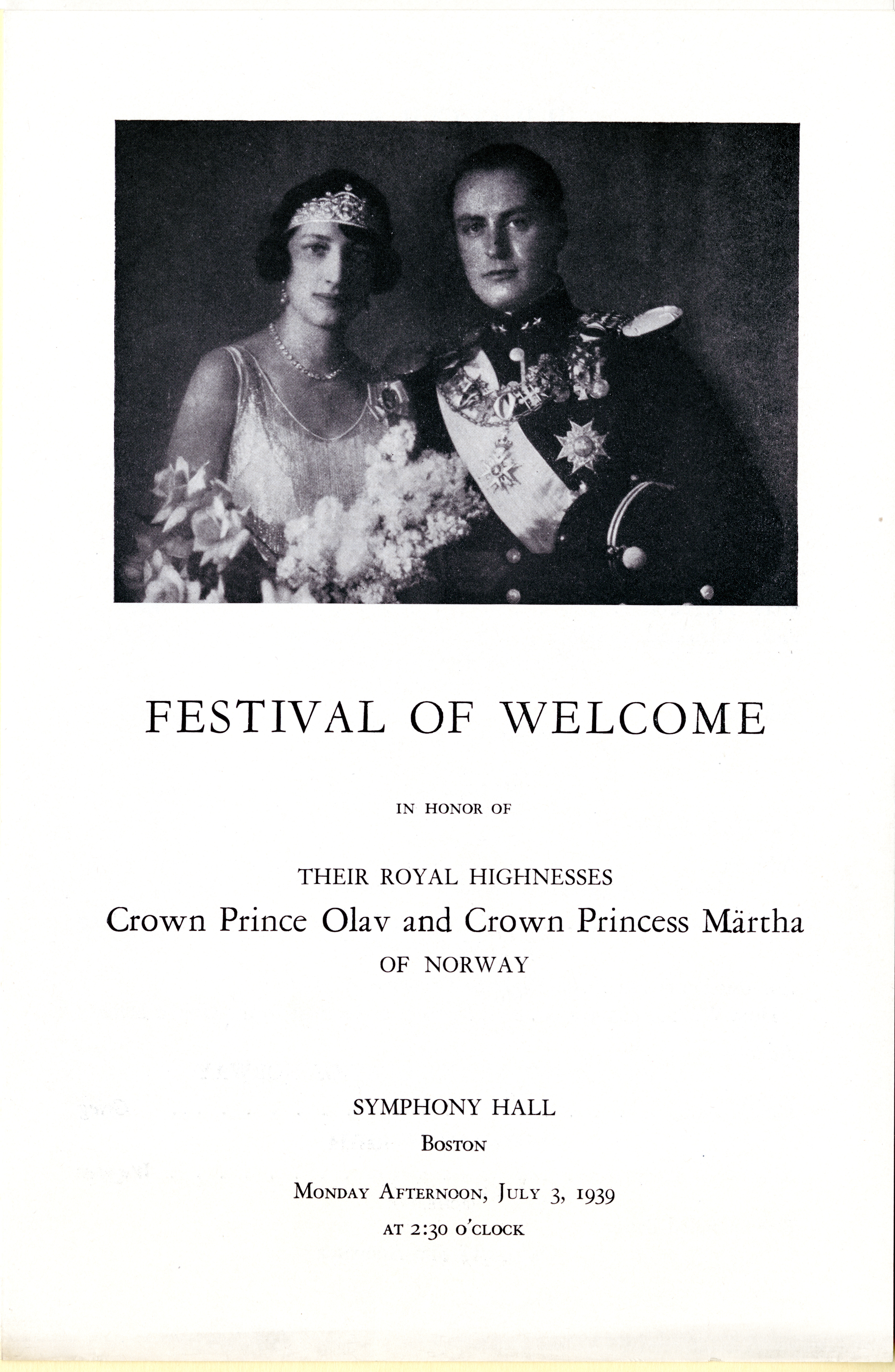 As part of a program of sightseeing, public appearances, and yachting during celebrations for America's Independence Day, the Crown Prince and Princess of Norway visited Boston in 1939. The heir apparent of the throne of Norway greeted members of the public at Symphony Hall as part of his busy visit. (Boston Globe July 2, 1939).