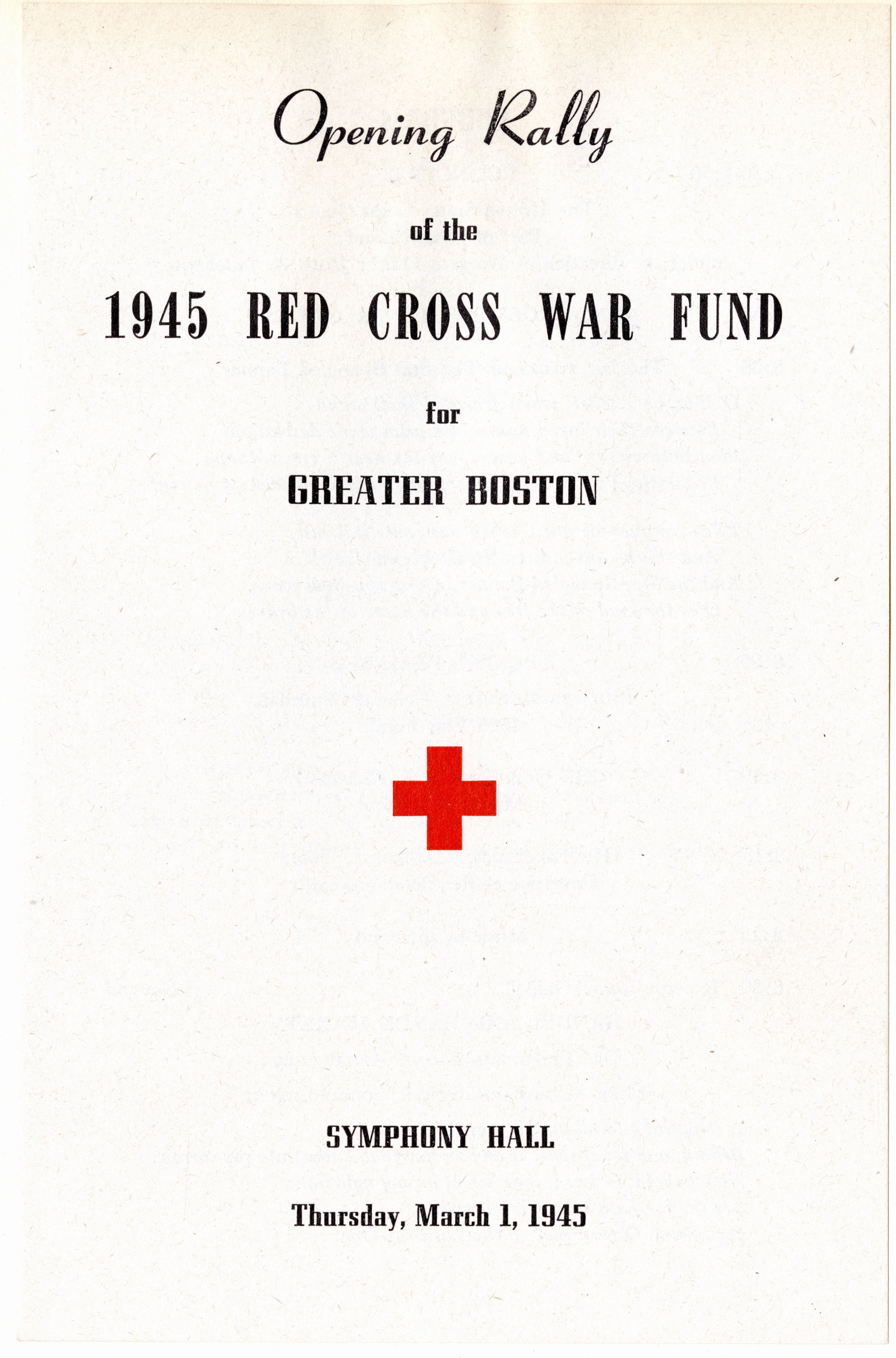 Ultimately raising over $300,000 in the Greater Boston Area, the Red Cross War Fund hosted a regional opening rally at Symphony Hall in March 1945. With Archbishop Richard J. Cushing as principal speaker, the rally also featured a pageant titled “Keep Your Red Cross at His Side” during which 600 Red Cross workers and servicemen participated. The rally launched a series of campaign collection events throughout Greater Boston on subsequent days ending on March 26th, 1945. (Boston Globe, March 1, 1945).