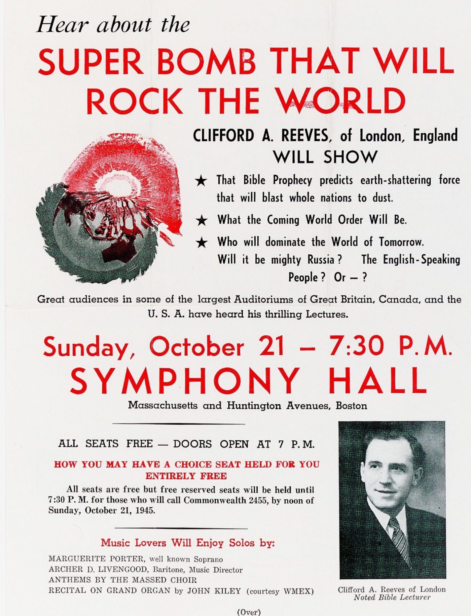 Clifford A. Reeves, a Bible Lecturer from London, England delivered a talk in October 1945 where he claimed to show that “Bible Prophecy predicts earth-shattering force that will blast whole nations to dust.” Asking questions about what the new world would be and who would dominate it, Reeves attracted large audiences for his talks in Great Britain, Canada, and the U.S. (Boston Globe, October 20, 1945).