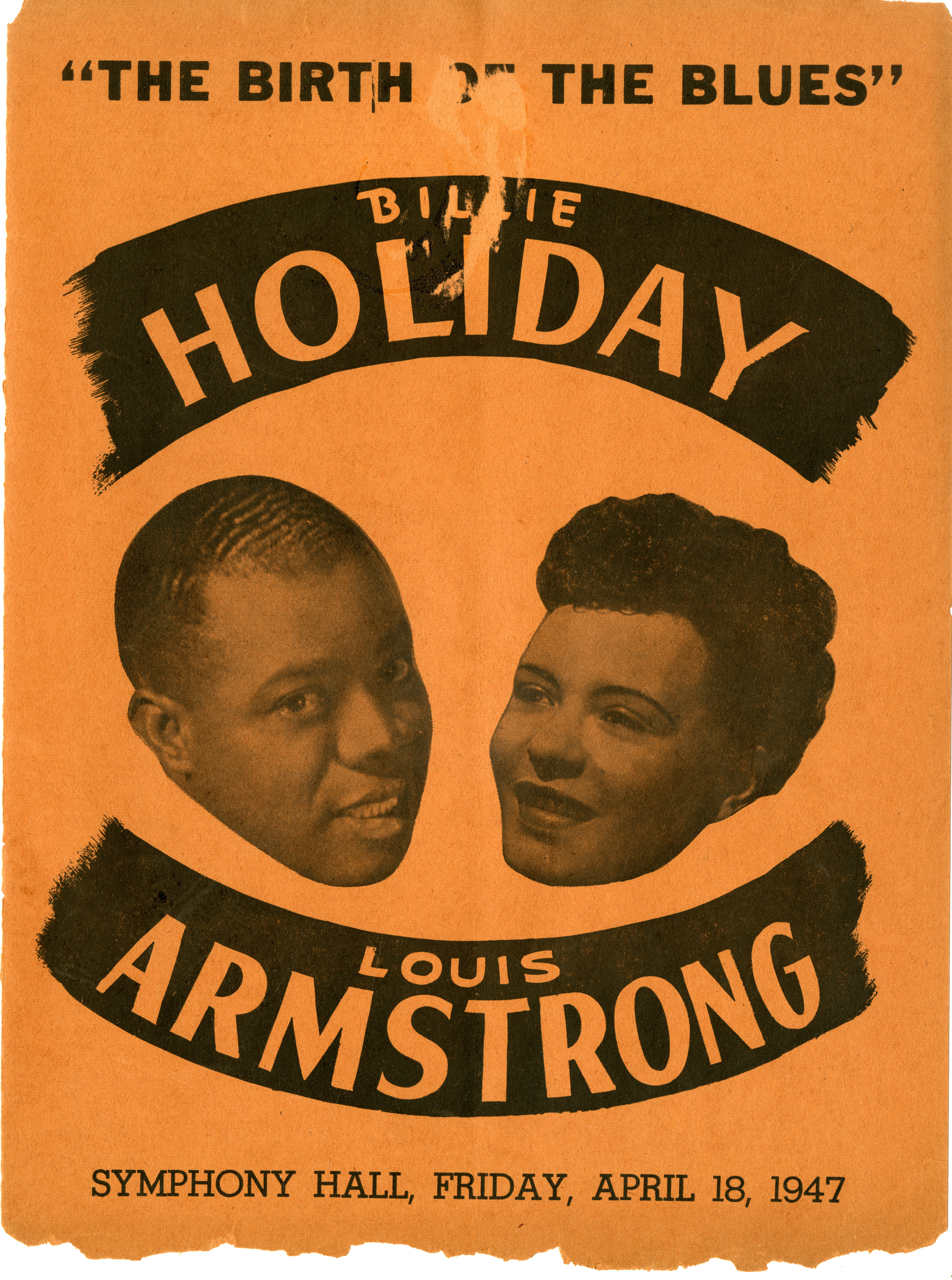 Flyer for a performance by Louis Armstrong and Billie Holiday's “The Birth of the Blues” on April 18th, 1947.