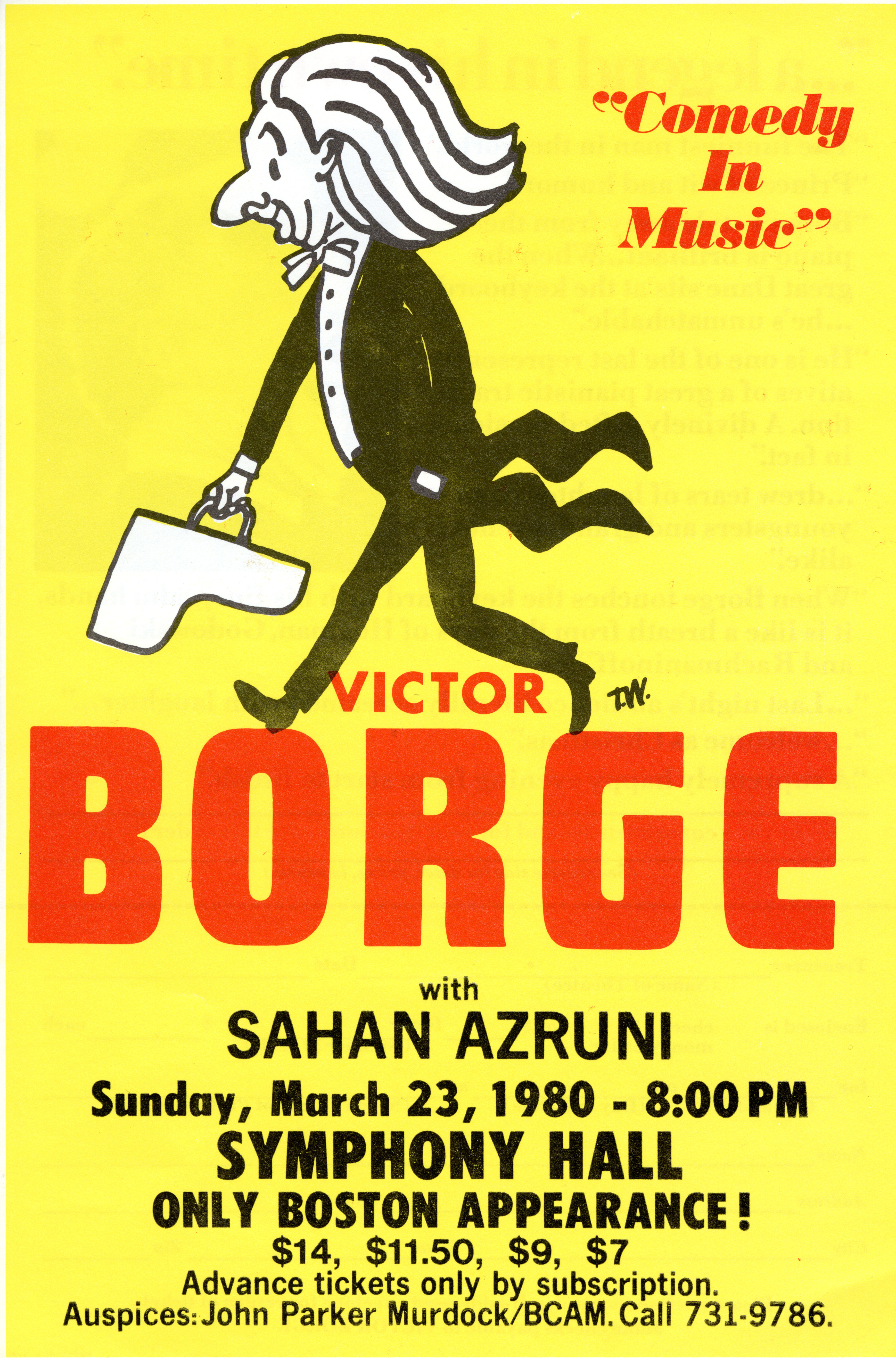 Victor Borge performed numerous times throughout the history of the Hall. Borge achieved popularity on the stage, radio, and television due to his blend of music and comedy. Borge made use of physical comedy and musicality during his routines, often misplaying the piano and falling off the bench. For his 1980 performance, the Globe commented that Borge “exhibits the kind of mastery of surprise, timing, and adaptability to any chance occurrence.” (Boston Globe, March 26, 1980).