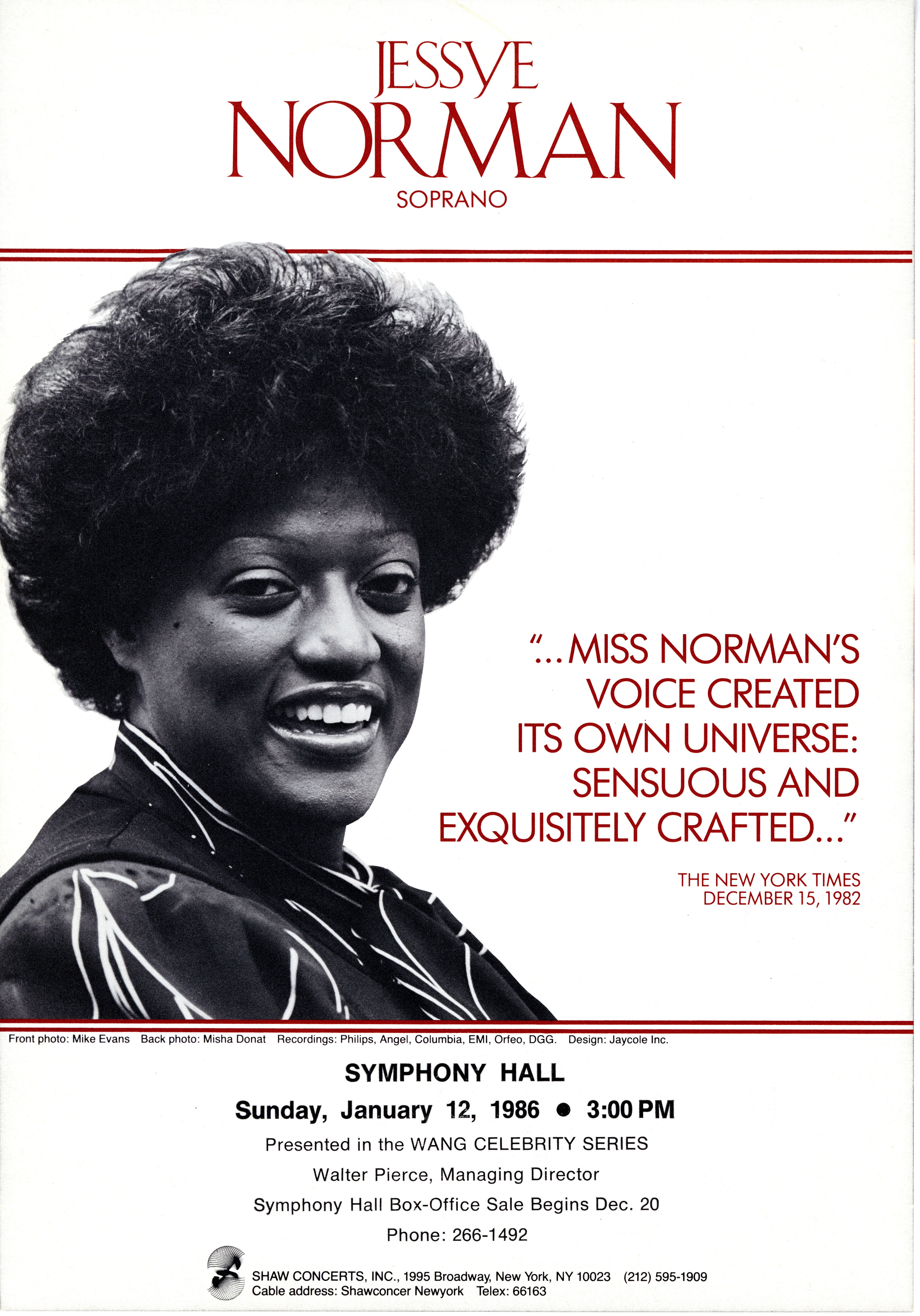 Flyer for a performance by Jessye Norman on January 12th, 1986.