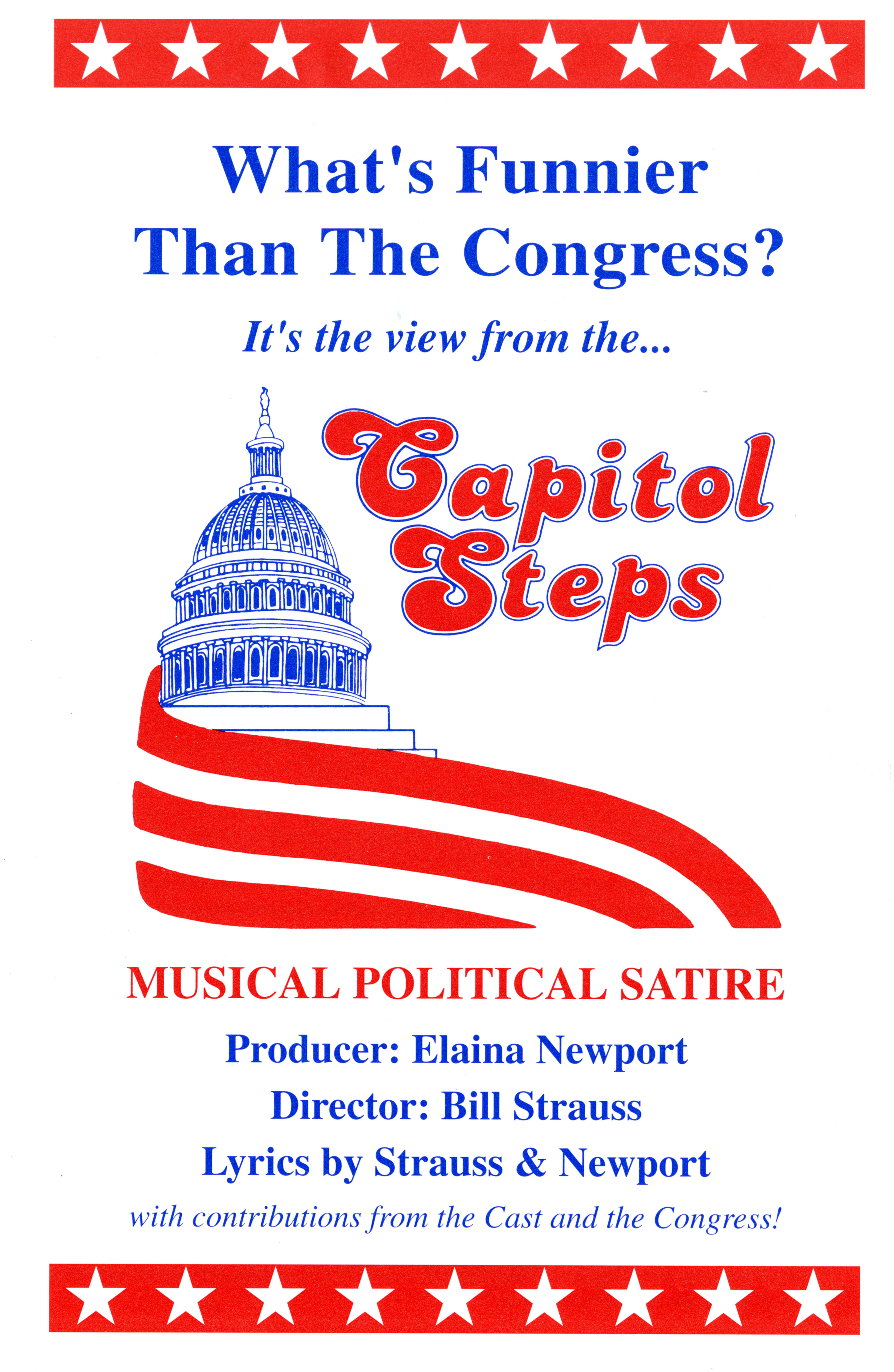 The Capitol Steps, a “politically correct, hygienic, bipartisan troupe of current and former Congressional staffers” performed a series of satirical songs at Symphony Hall on February 3rd, 1995. Produced by Elaina Newport and directed by Bill Strauss, the group parodied existing songs to poke fun at political figures and events.