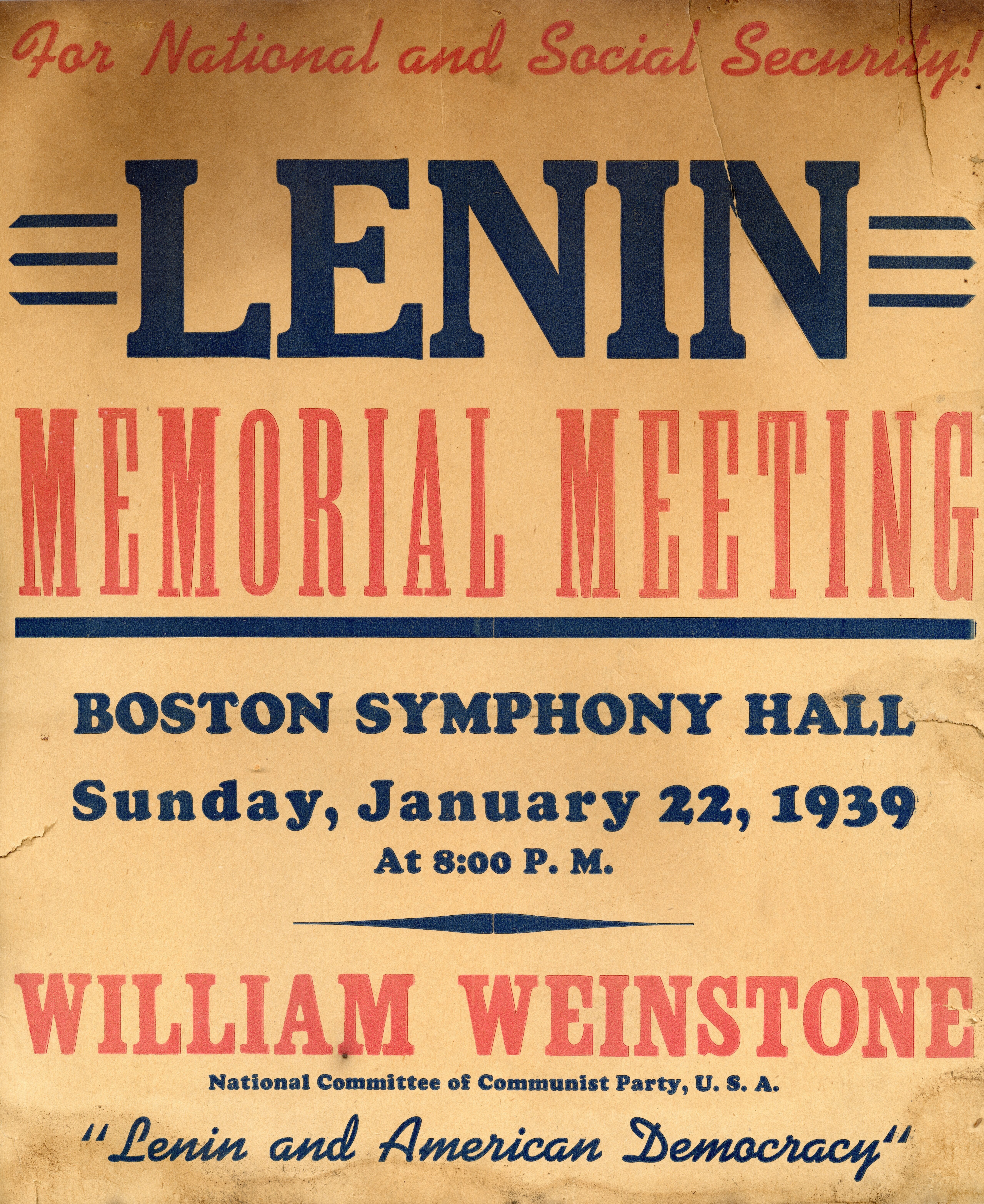 Under the auspices of the Communist Party of Massachusetts, a Lenin Memorial Meeting was held at Symphony Hall in January 1939. William Weinstone, the Executive Secretary of the unified Communist Party of America, gave a speech titled “Lenin and American Democracy.”