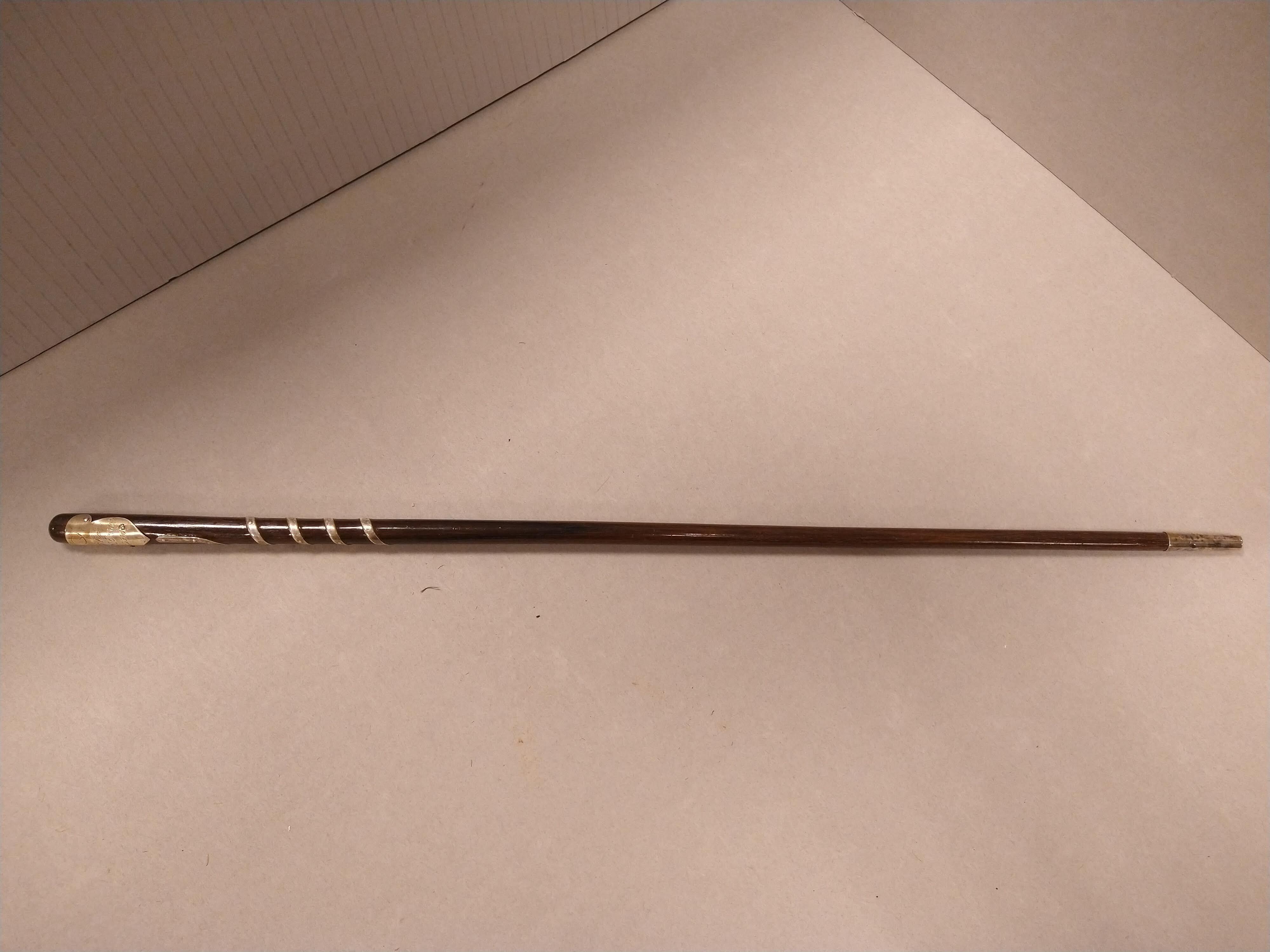 Hickory baton with gold plated sterling tip and plaque engraved with the Goldman Band’s name, 1920s