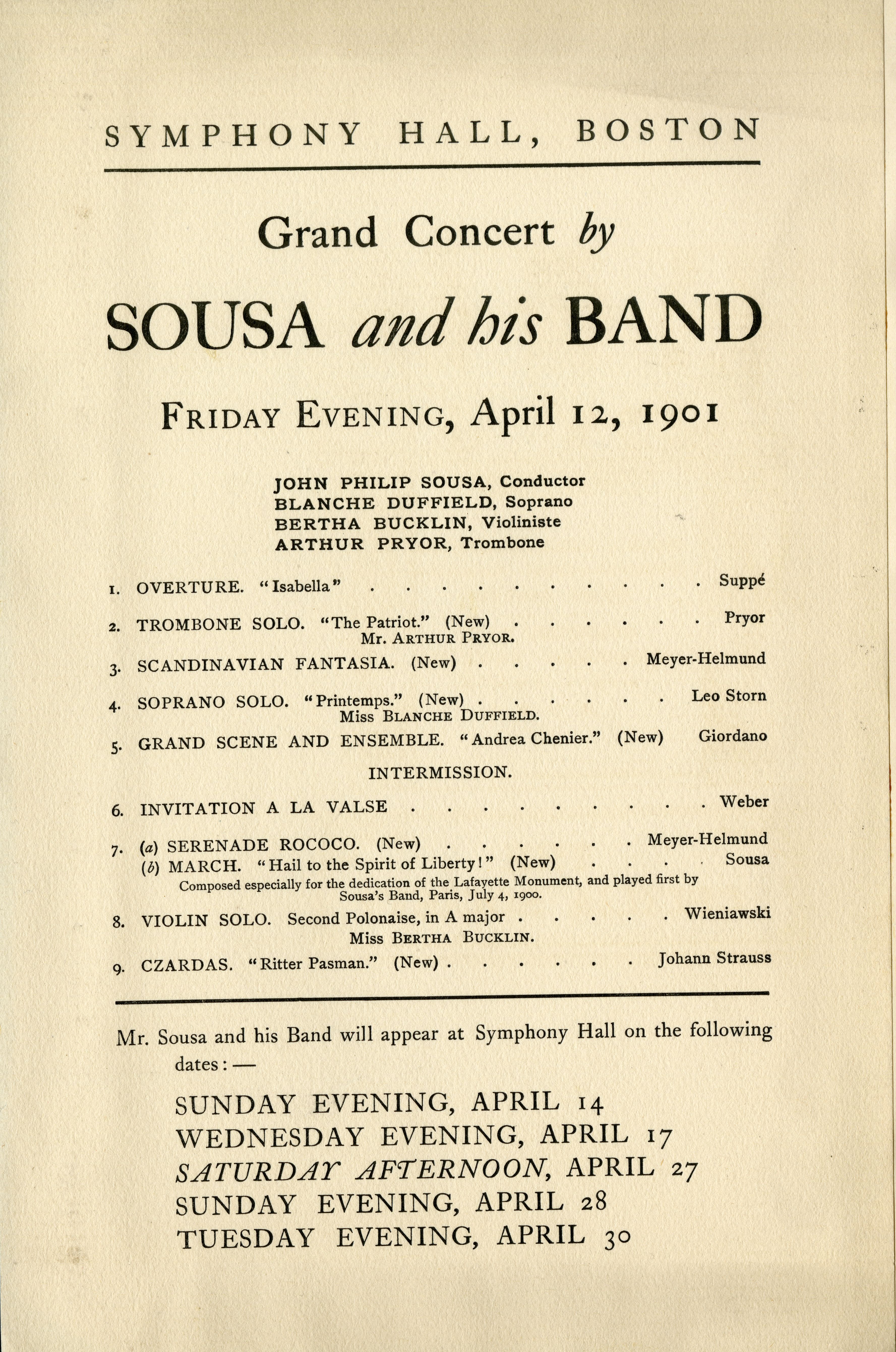 Program for a performance by John Philip Sousa and the Sousa Band at Symphony Hall on April 12, 1901
