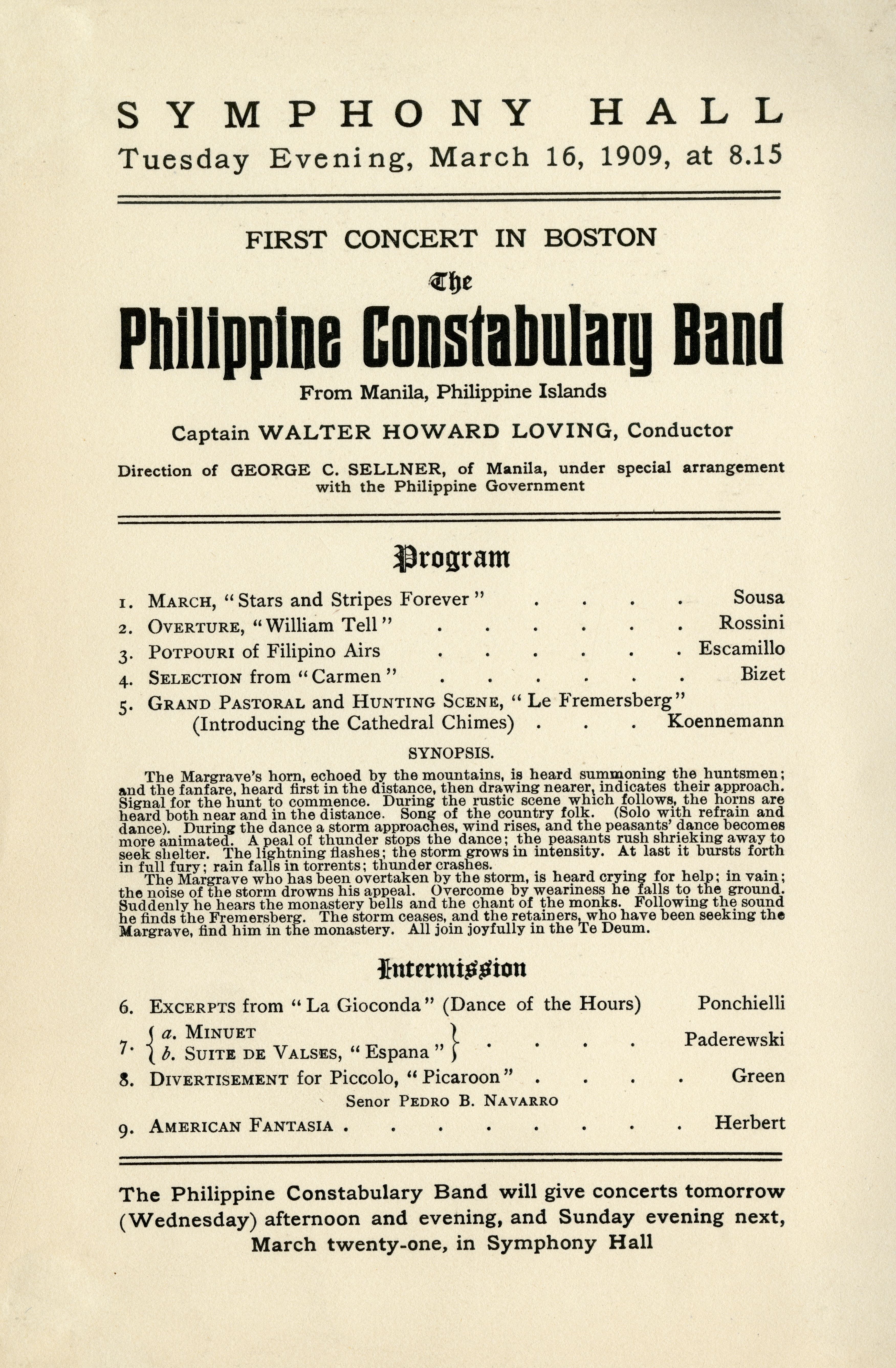 Program for the performance of the Philippine Constabulary Band at Symphony Hall on March 16, 1909