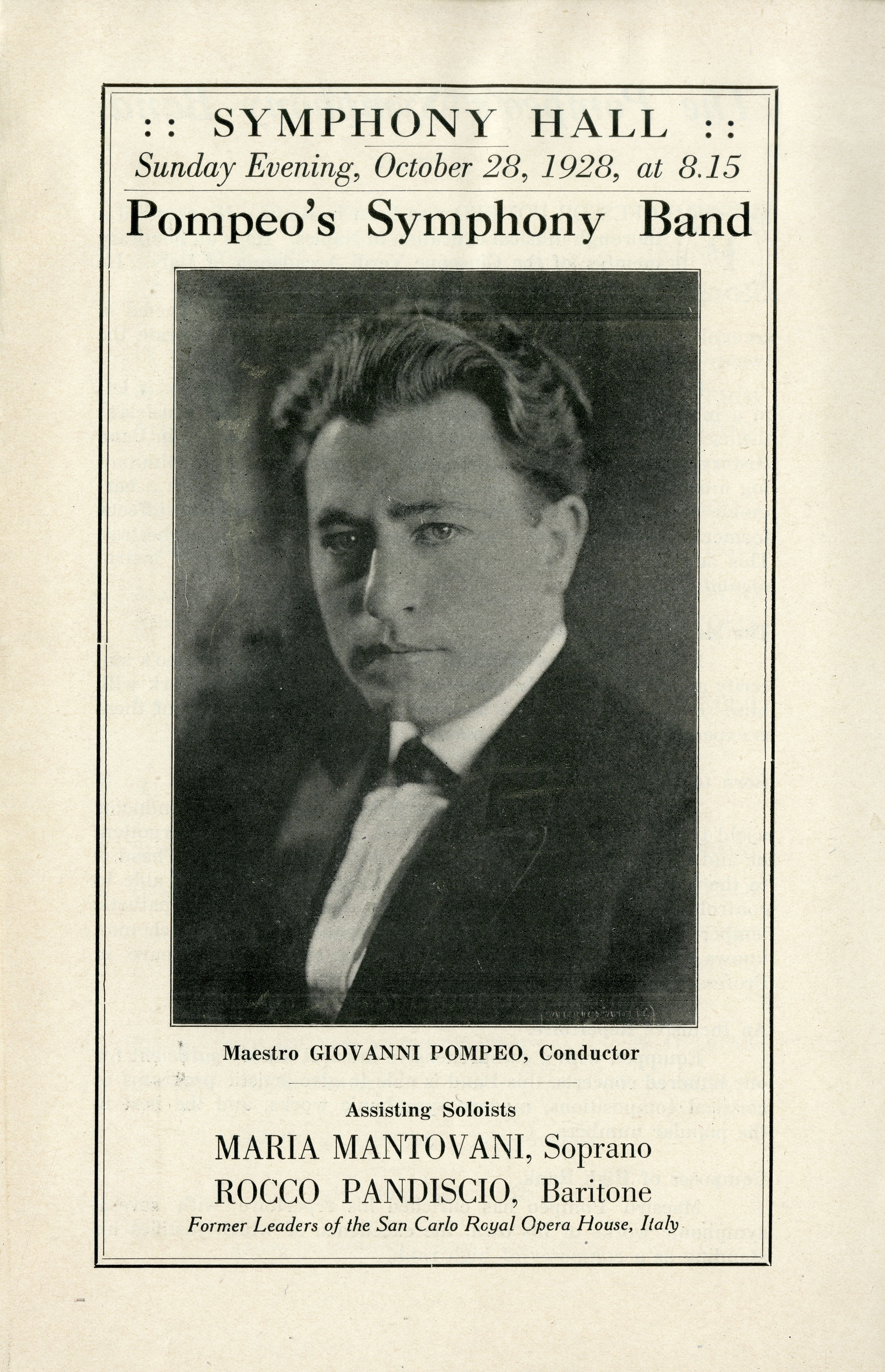 Program for a performance by Pompeo’s Symphony Band on October 28, 1928 in Symphony Hall