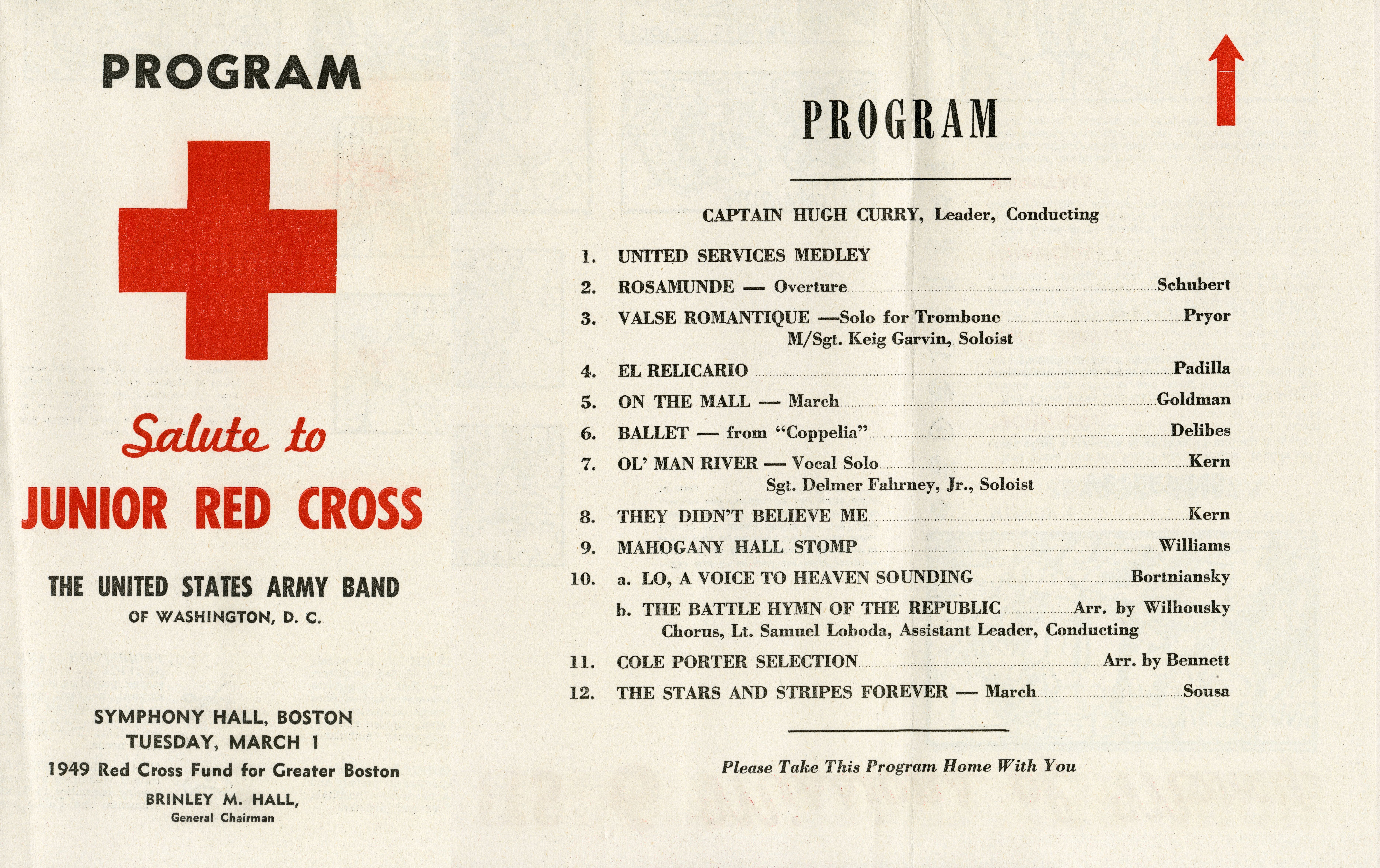 Program for a performance by the United States Army Band in support of the Red Cross on March 1, 1949 at Symphony Hall