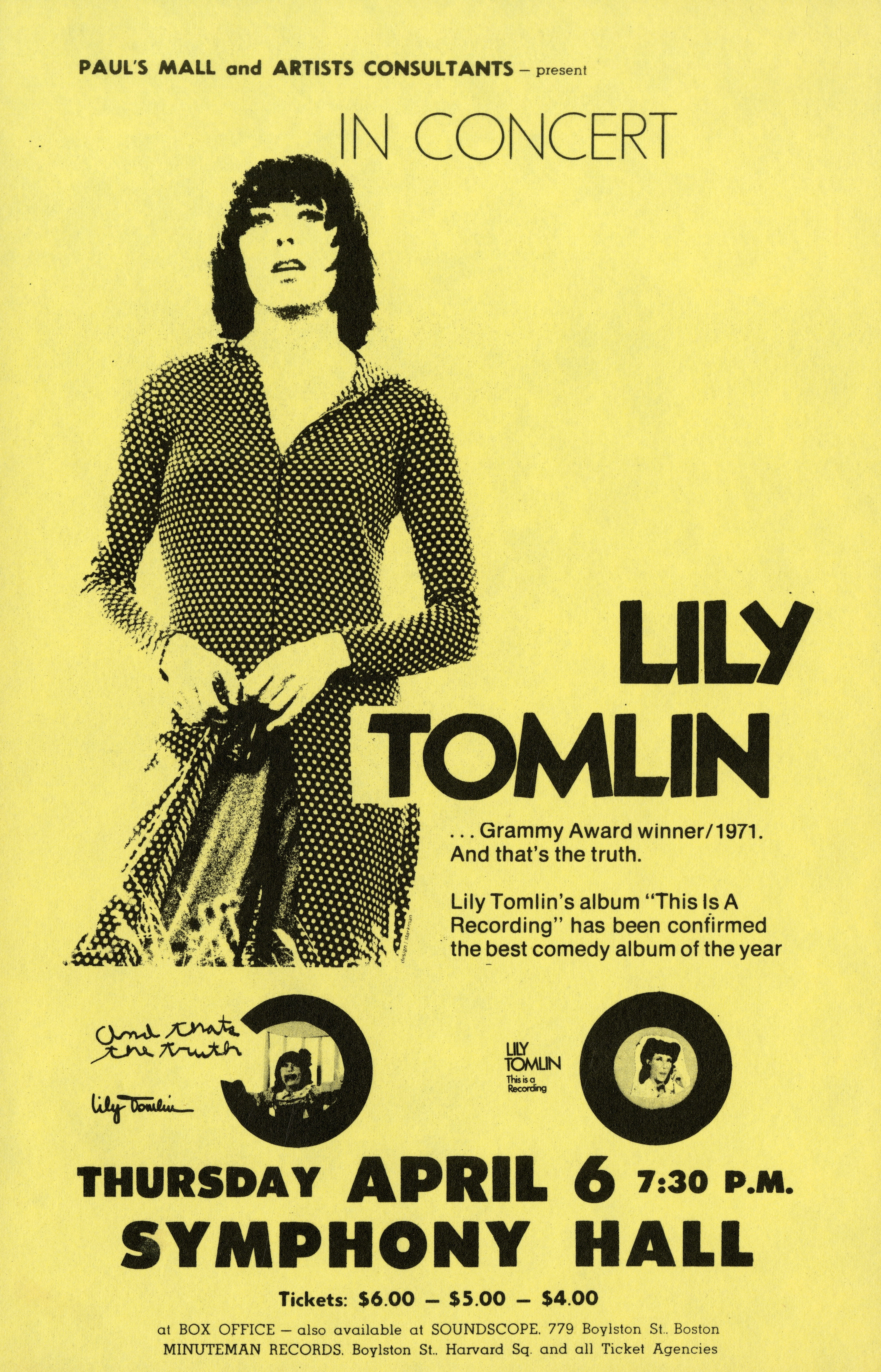 Poster advertising Lily Tomlin’s appearance at Symphony Hall on April 6, 1972