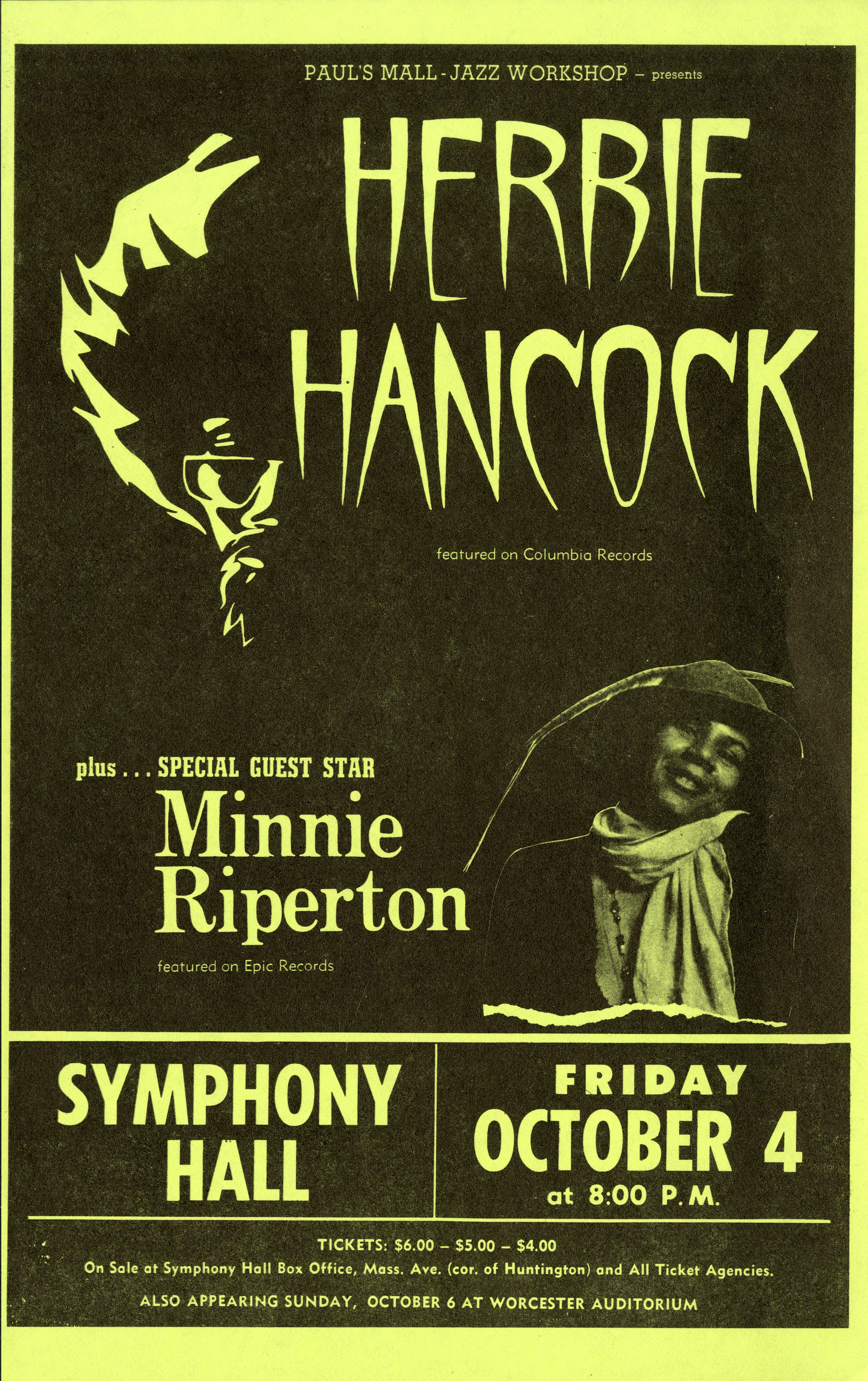 Poster advertising Herbie Hancock’s appearance with Minnie Riperton at Symphony Hall on October 4, 1974