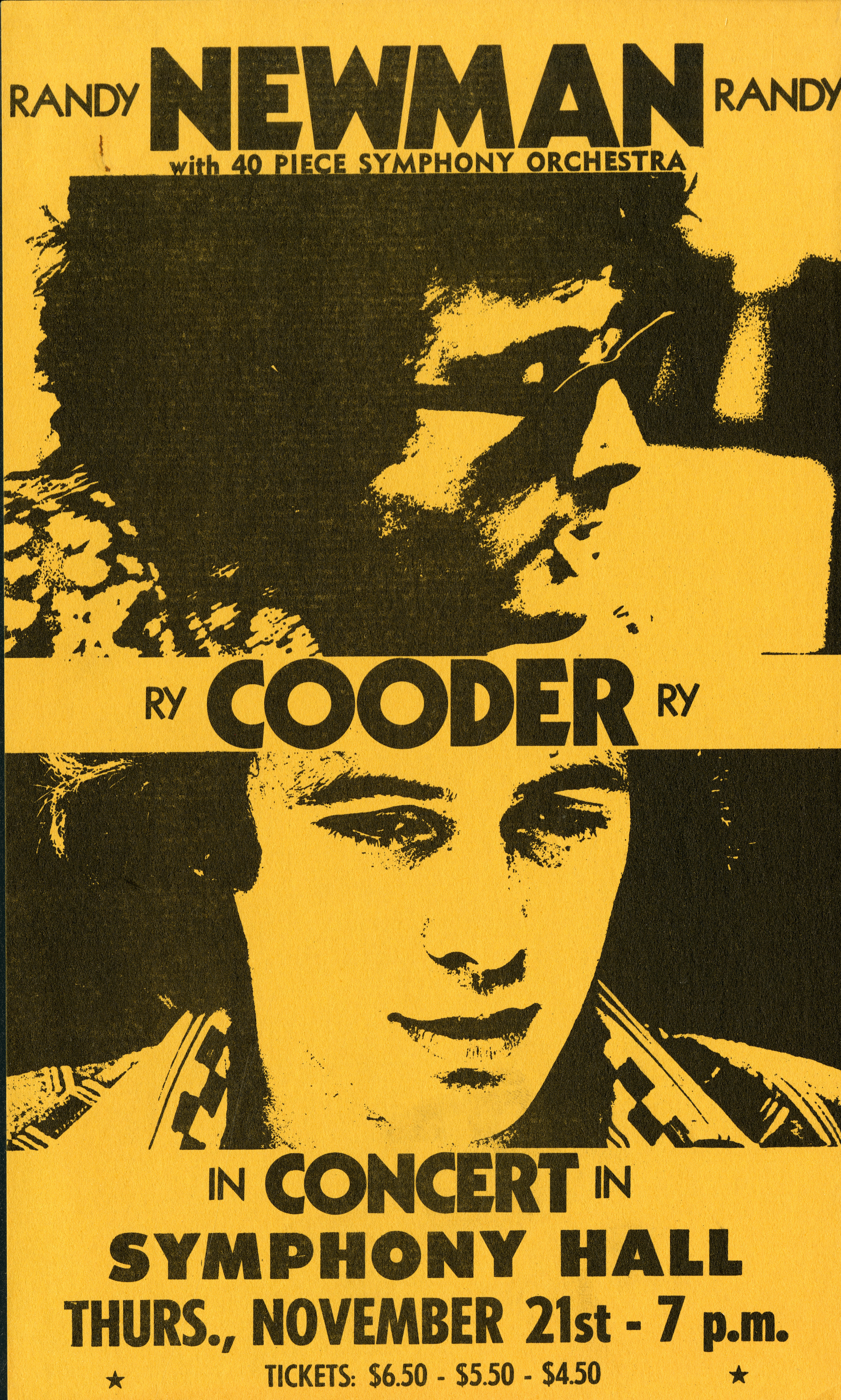 Poster advertising Randy Newman and Ry Cooder’s performance at Symphony Hall on November 21, 1974