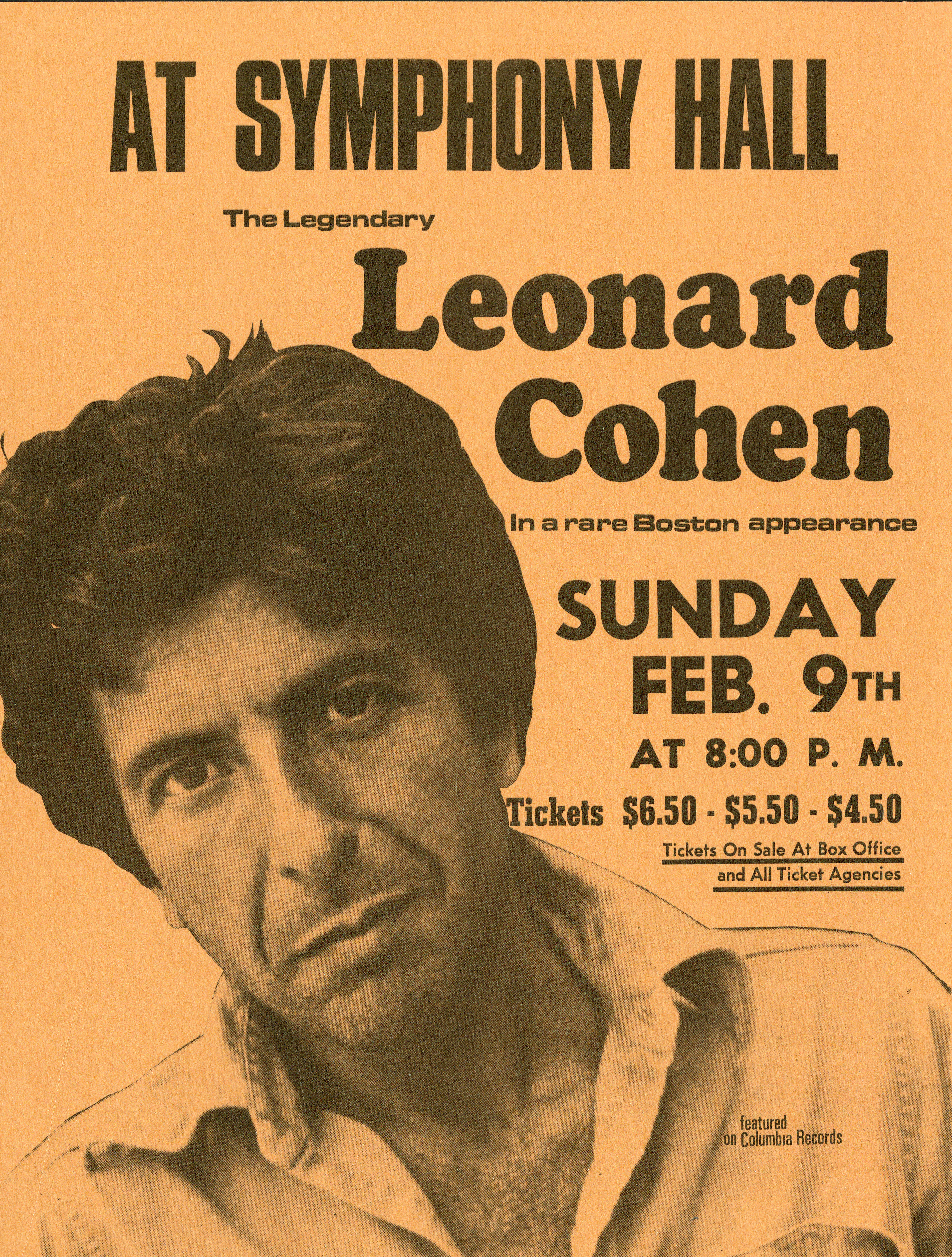 Poster advertising Leonard Cohen’s appearance at Symphony Hall on February 9, 1975
