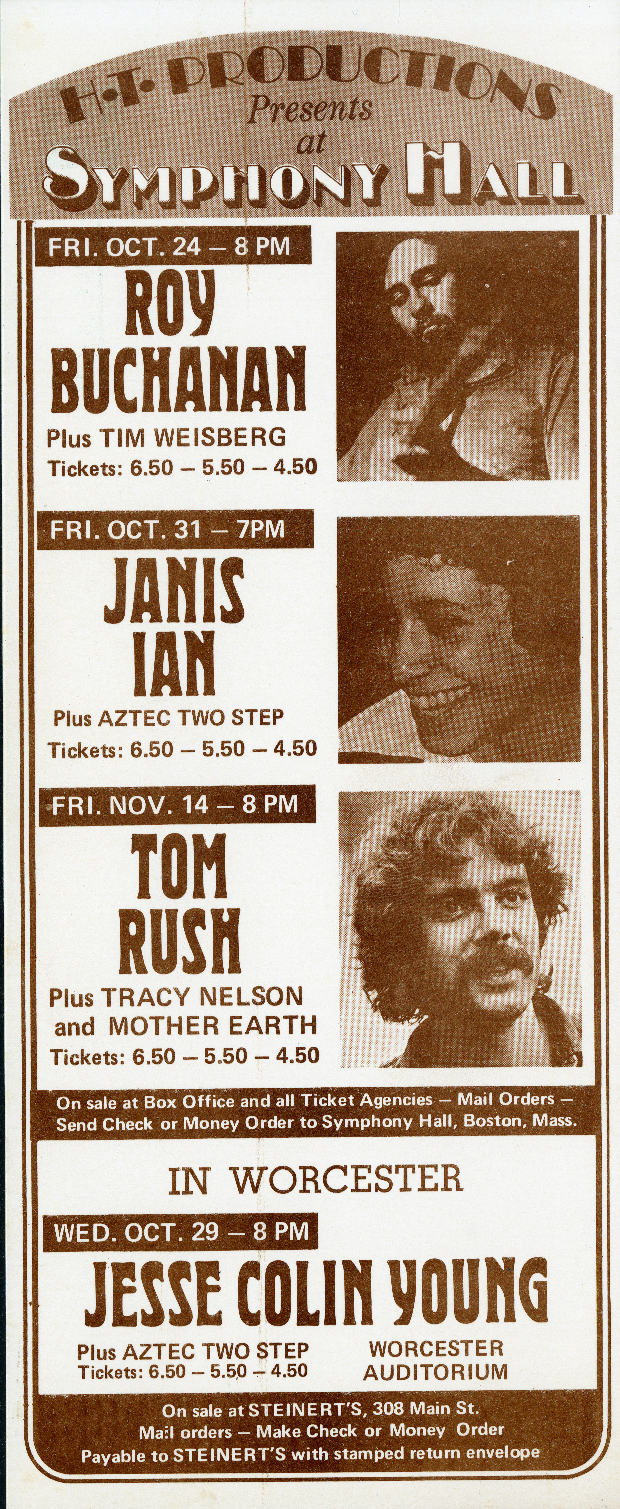 Flyer advertising upcoming performances at Symphony Hall: Roy Buchanan with Tim Weisburg on October 24, 1975; Janis Ian with Aztec Two Step on October 31, 1975; Tom Rush with Tracy Nelson and Mother Earth on November 14, 1975