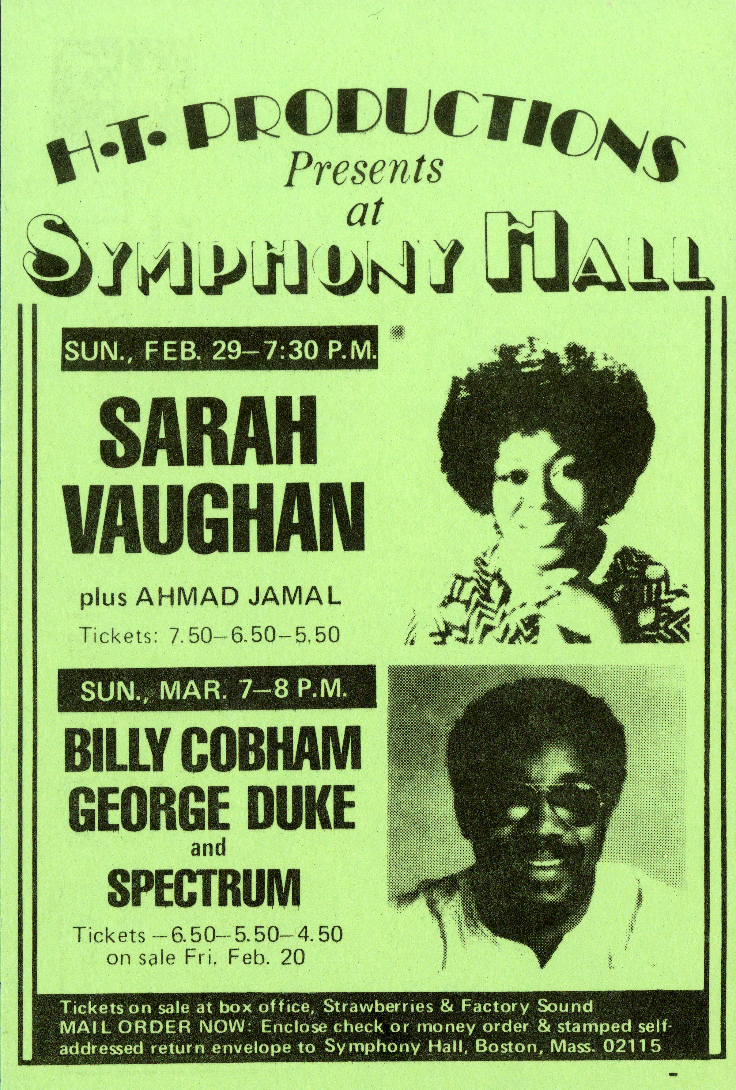 Flyer advertising upcoming performances at Symphony Hall: Sarah Vaughan with Ahmad Jamal on February 29, 1976; Billy Cobham, George Duke and Spectrum on March 7, 1976