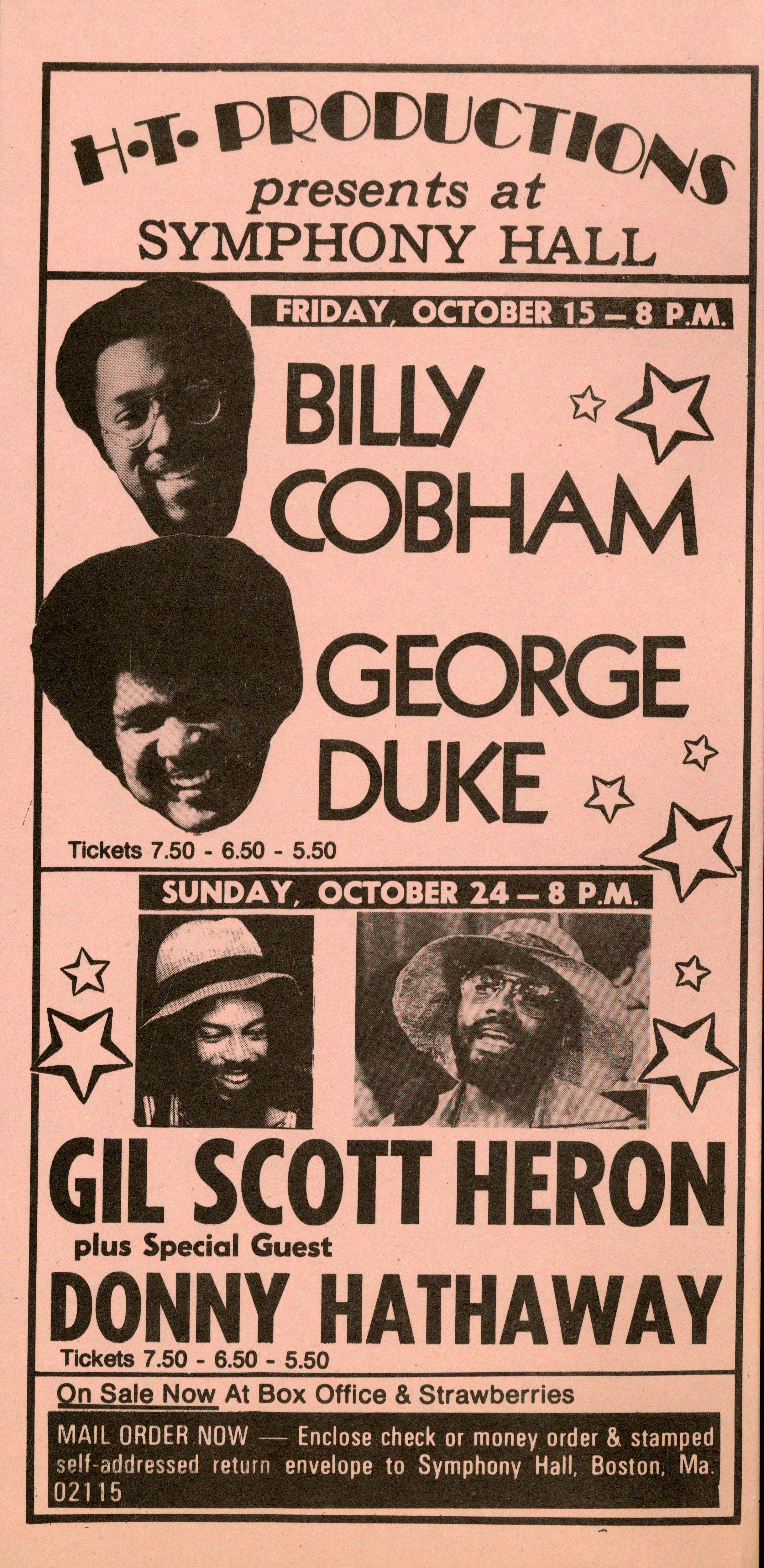 Flyer advertising upcoming performances at Symphony Hall: Billy Cobham and George Duke on October 15, 1976; Gil Scott Heron and Donny Hathaway on October 24, 1976