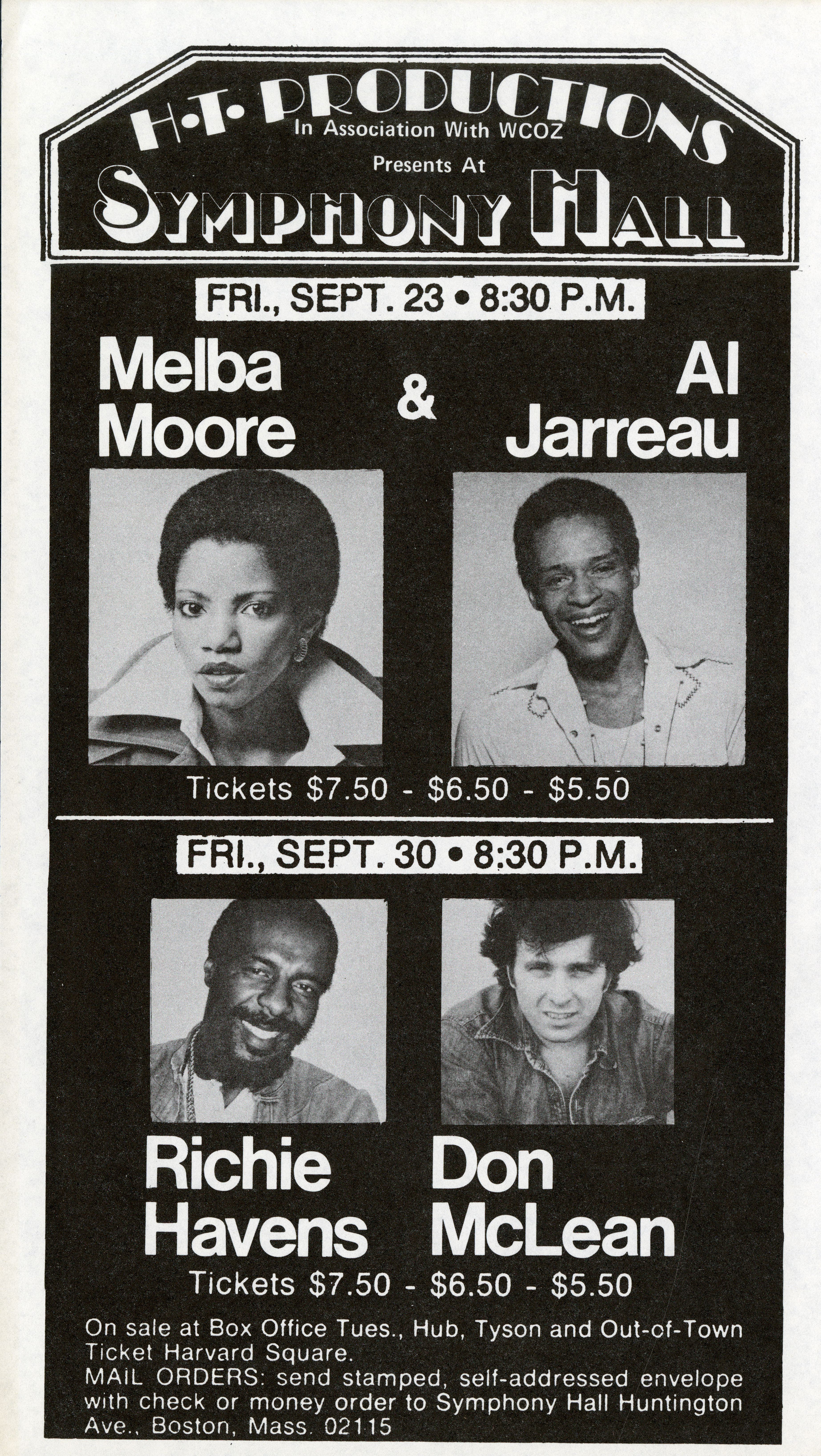 Flyer advertising upcoming performances at Symphony Hall: Melba Moore and Al Jarreau on September 23, 1977; Richie Havens and Don McLean on September 30, 1977
