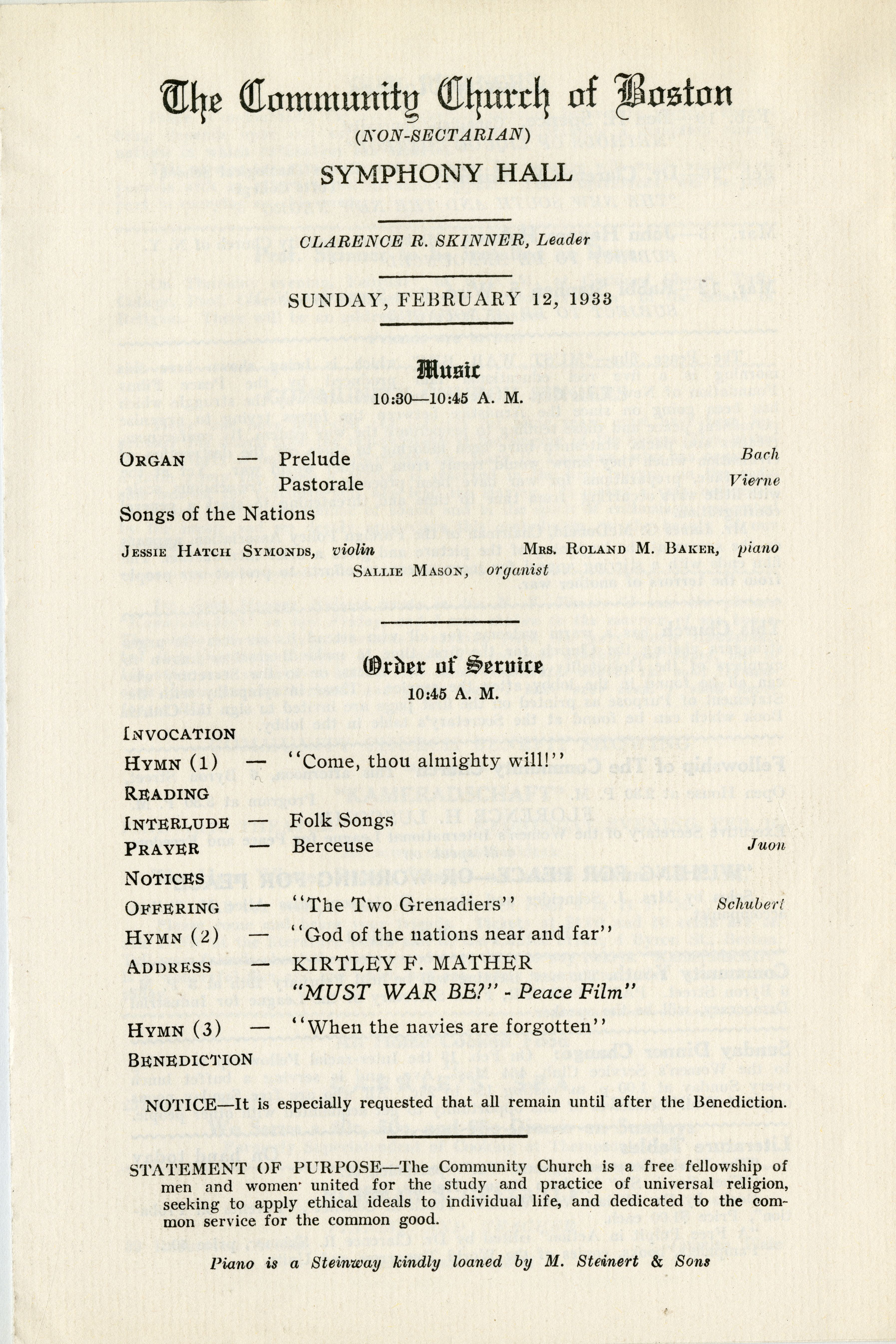 With Japan on the brink of leaving the League of Nations and mere weeks after Hitler rose to power in Germany, the Community Church of Boston (which met in Symphony Hall) presented a call to peace among uncertain times.