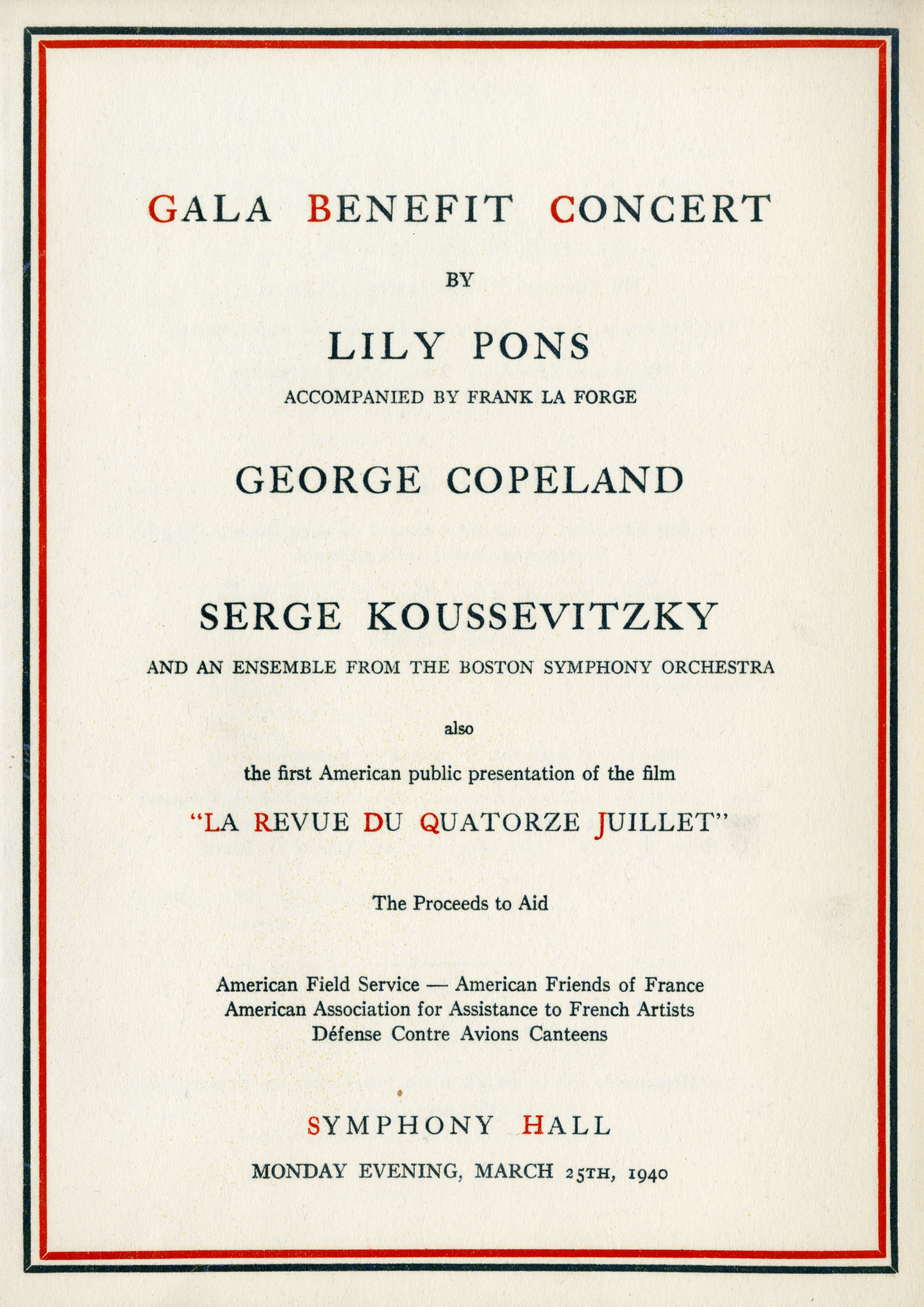In addition to a screening of the French film Quattorze Juillet (July 14th), the benefit also included performances by singer Lily Pons, pianist George Copeland, and members of the BSO with Serge Koussevitzky.