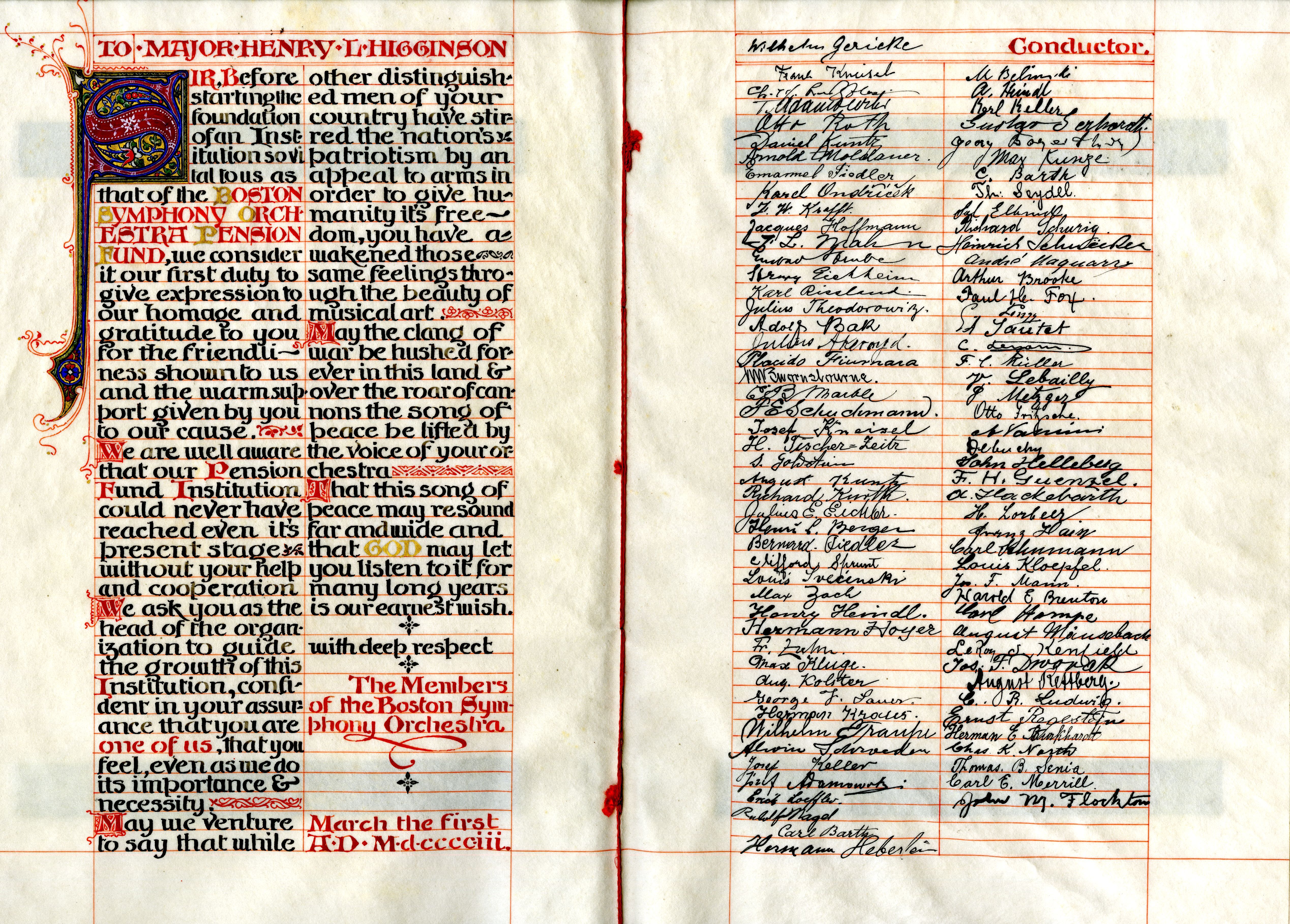 Tribute to Henry Lee Higginson from the BSO musicians to show their appreciation for Higginson’s role in the establishment of the Boston Symphony Orchestra Pension Institution, March 1, 1903. Signatures on the right side of the page include Wilhelm Gericke’s (top) as well as the BSO players. Excerpt from the text: