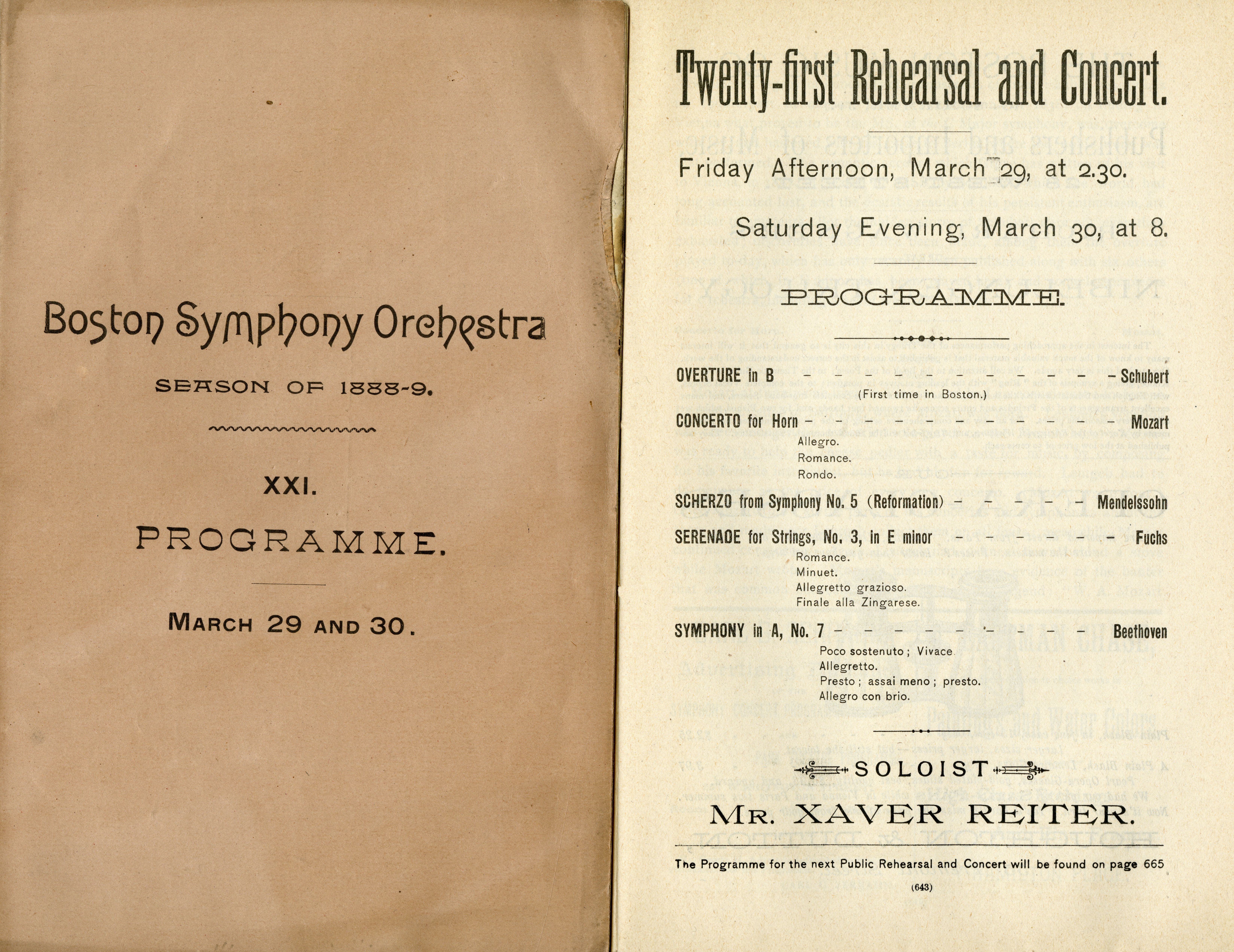 Program for BSO concert of March 29 and 30, 1889, which featured a performance of Mozart’s Horn Concerto No. 4 in E-flat Major, K. 495, performed by Xaver Reiter