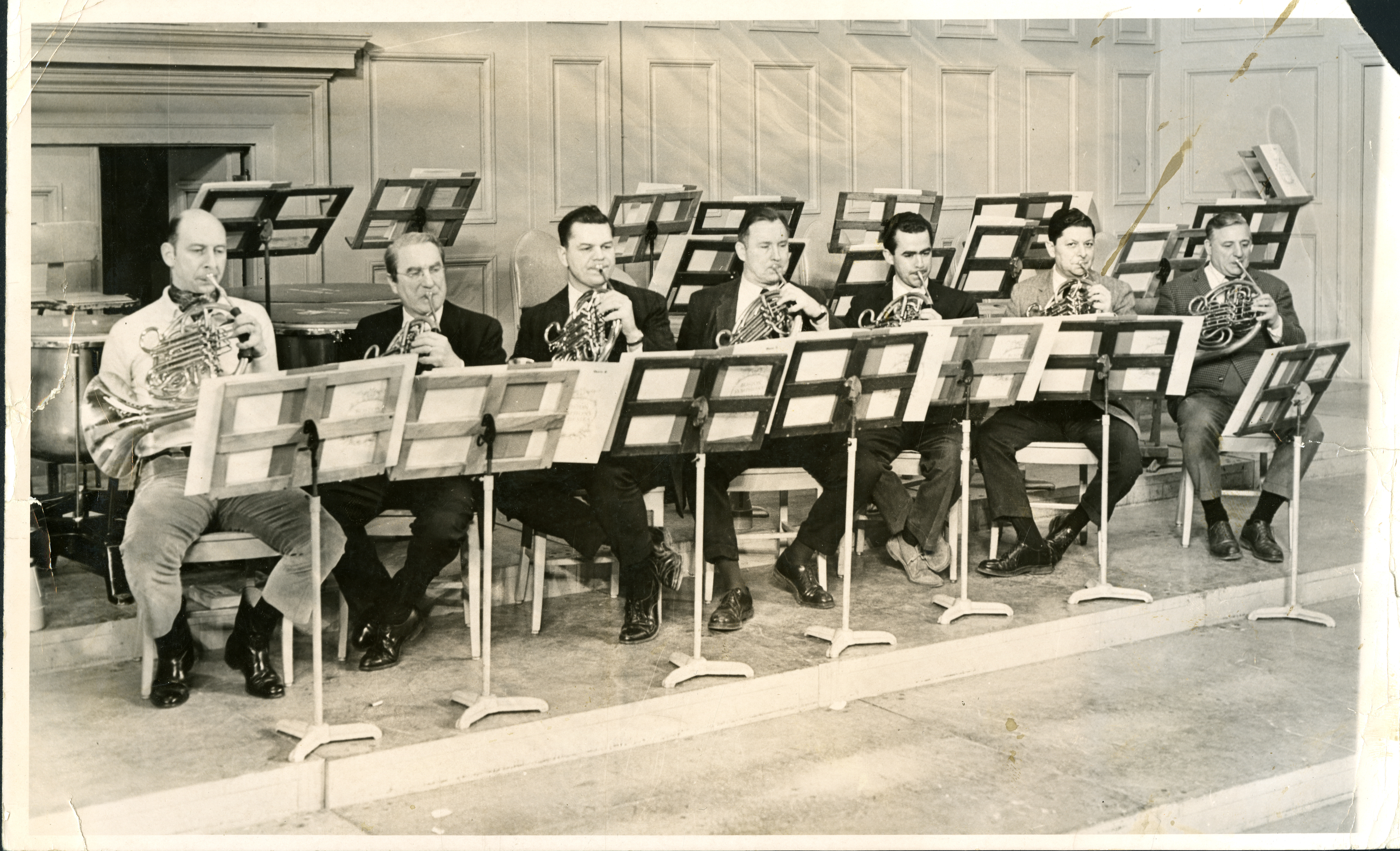 Members of the BSO horn section during the 1965-66 season, from left to right: Ralph Pottle, Osbourne McConathy, Charles Yanchich, Paul Keaney, Thomas Newell, Harry Shapiro, and principal James Stagliano