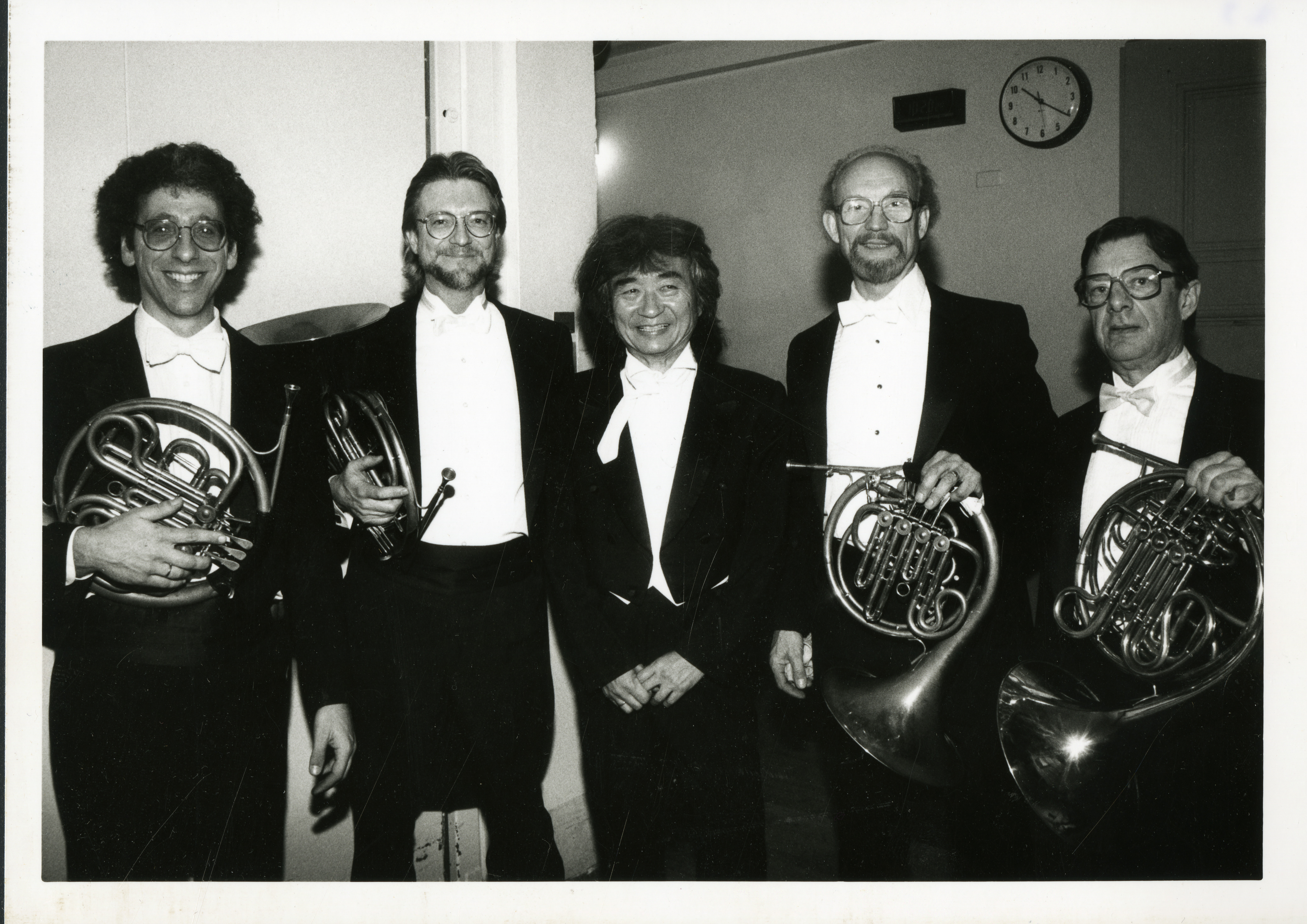 Seiji Ozawa stands with members of the horn section after the BSO’s April 15, 1994 performance of Robert Schumann’s Konzertstück in F major for 4 horns, Op. 86