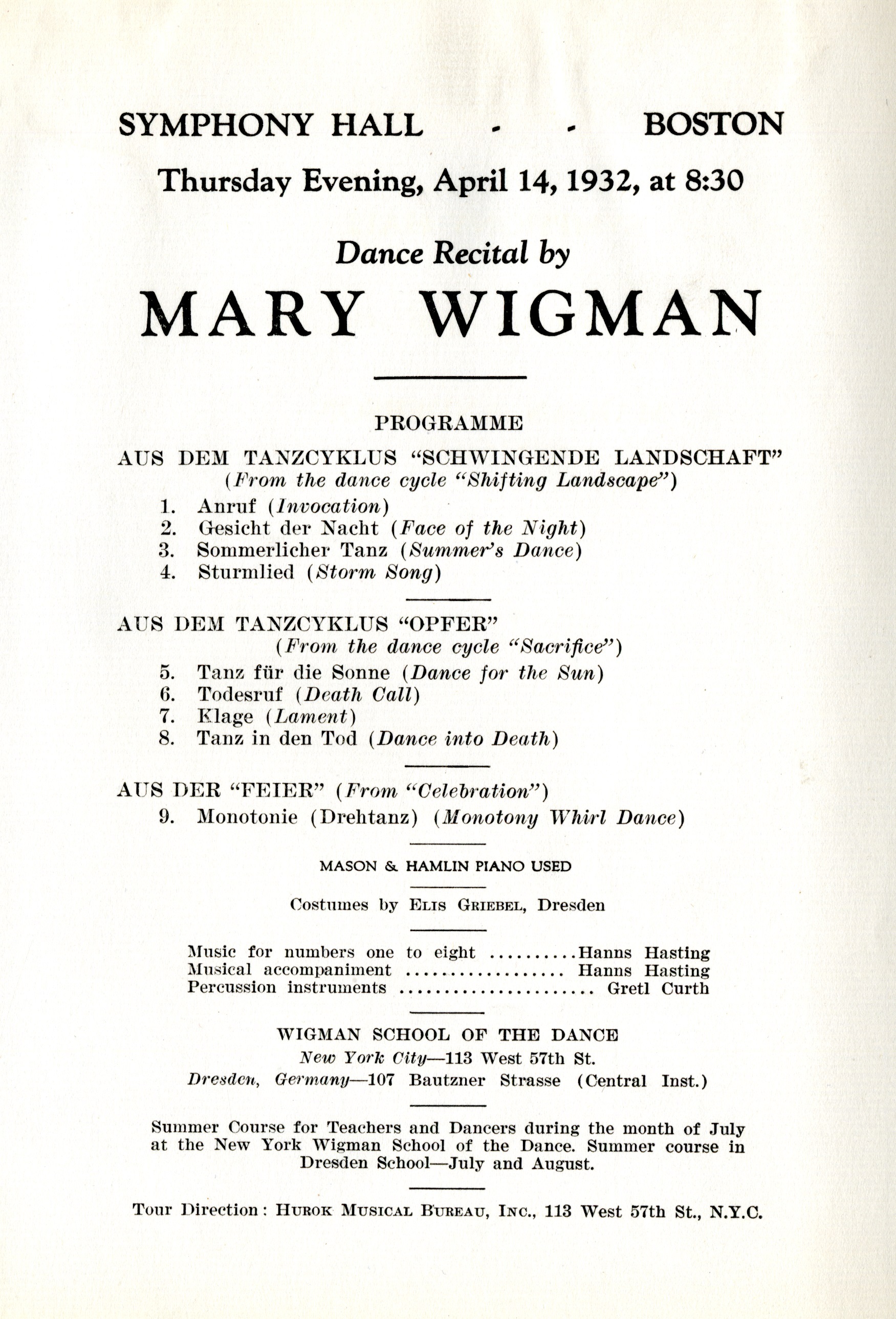 Concert program for Mary Wigman, April 14, 1932