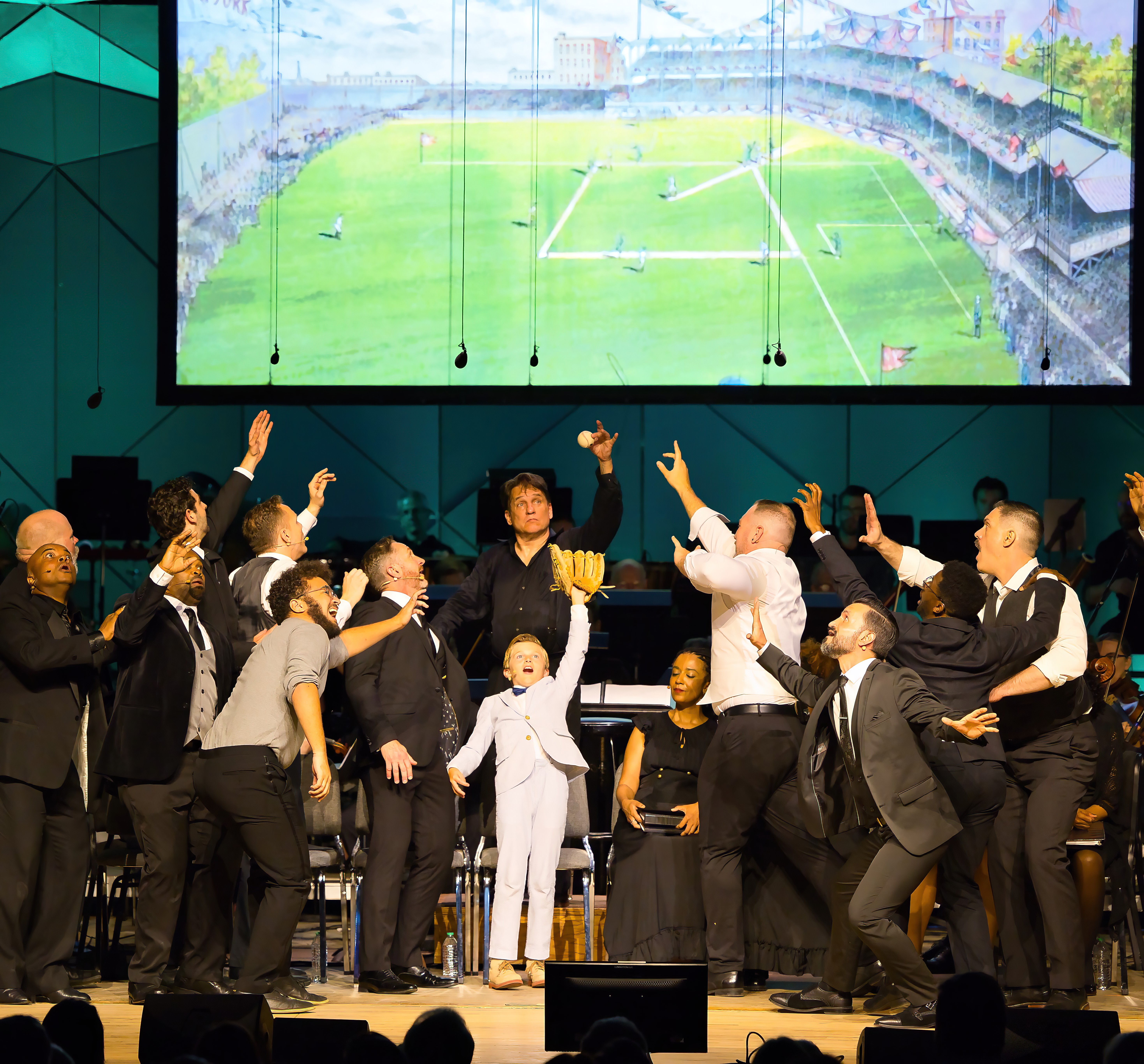 Conductor Keith Lockhart “catches” a fly ball during a Boston Pops performance of Stephen Flaherty’s Ragtime at Tanglewood, July 8, 2023